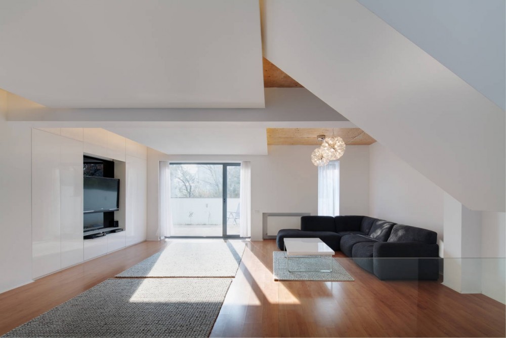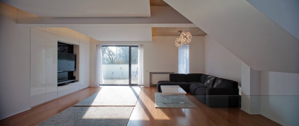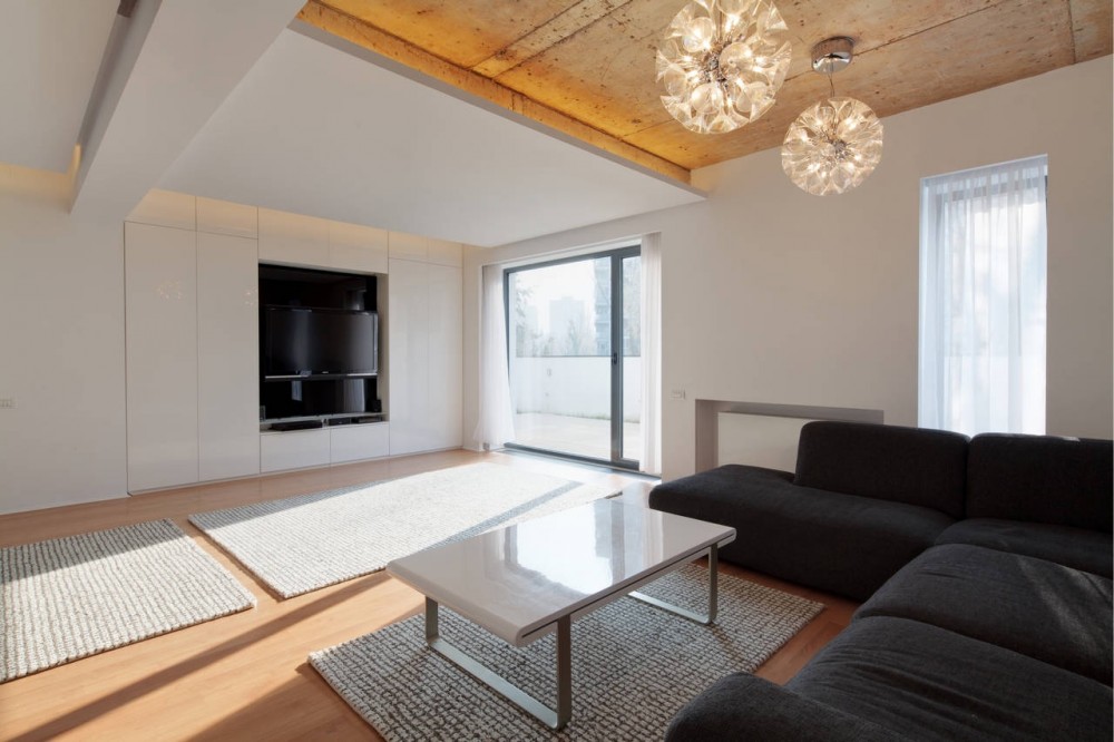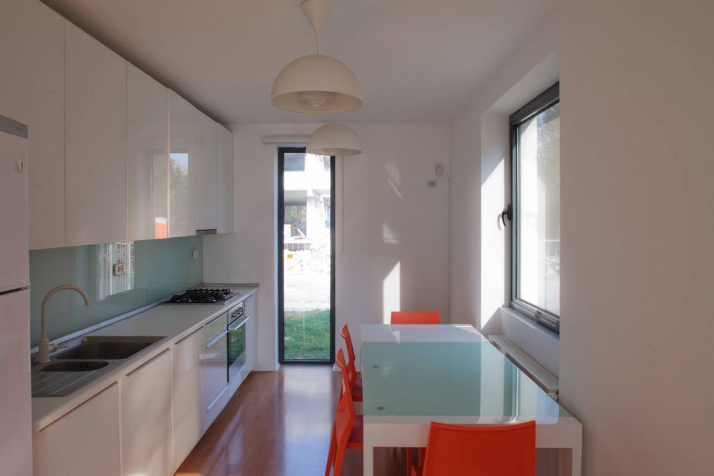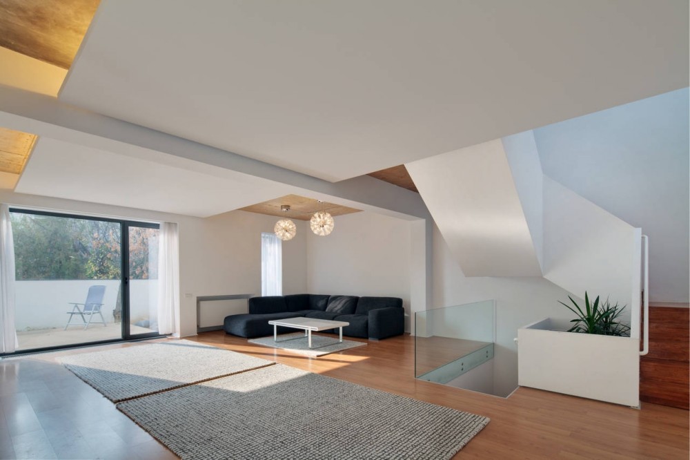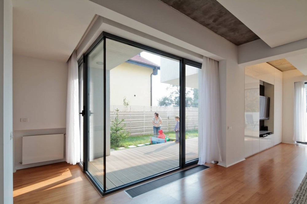 Tavanul din beton aparent al livingului, placarile cu sticla vopsita ale bailor, balustrada de sticla a scarii prinsa doar in cantul placii de beton, mobilierul la comanda incastrat si disimulat in culoarea peretelui, spatiile deschise, fluide illuminate natural, sunt solutii accesibile care odata acceptate isi dezvaluie atuurile, dand viata interiorului.