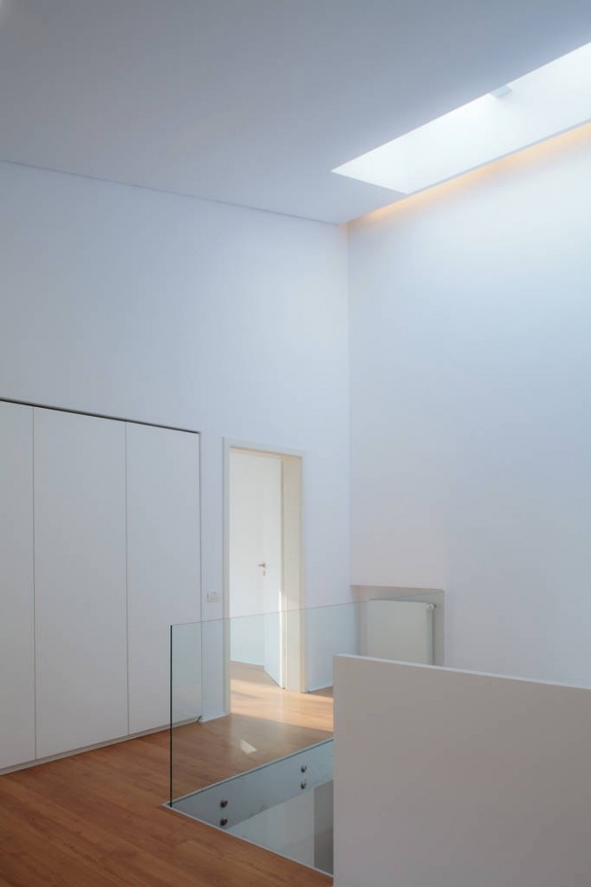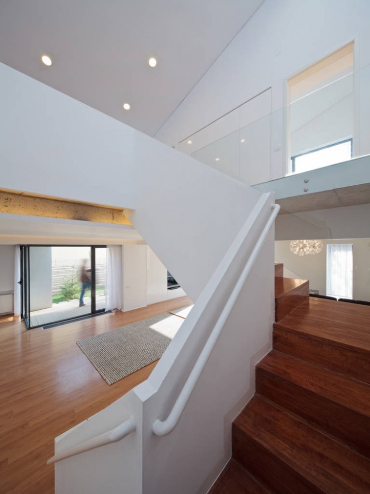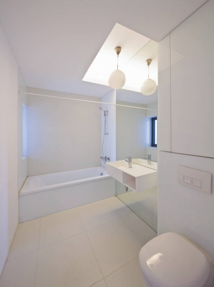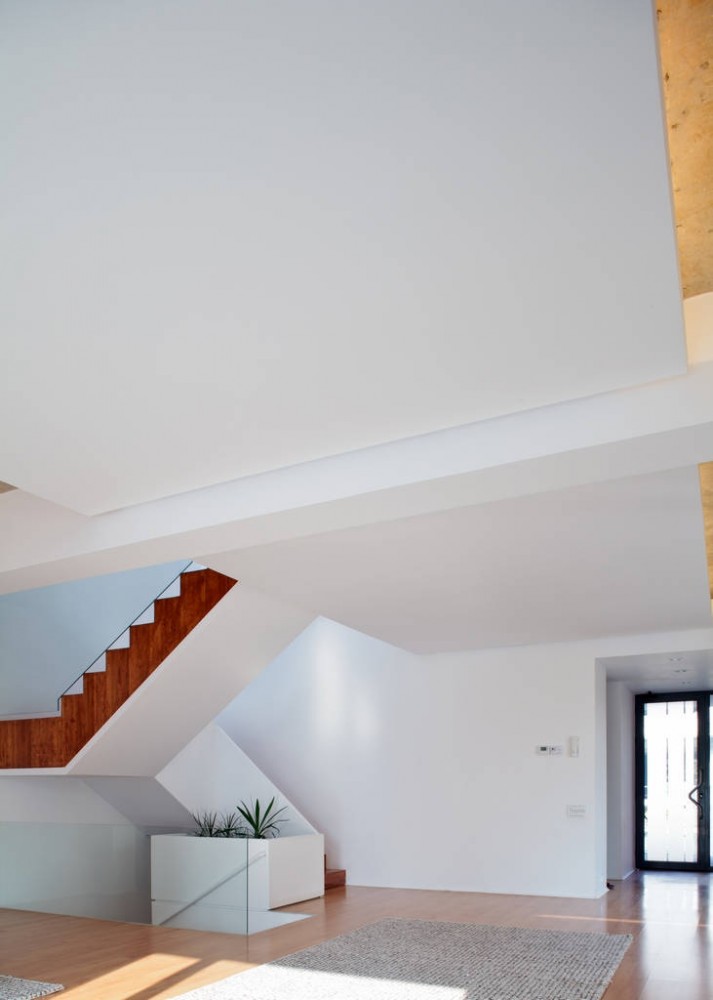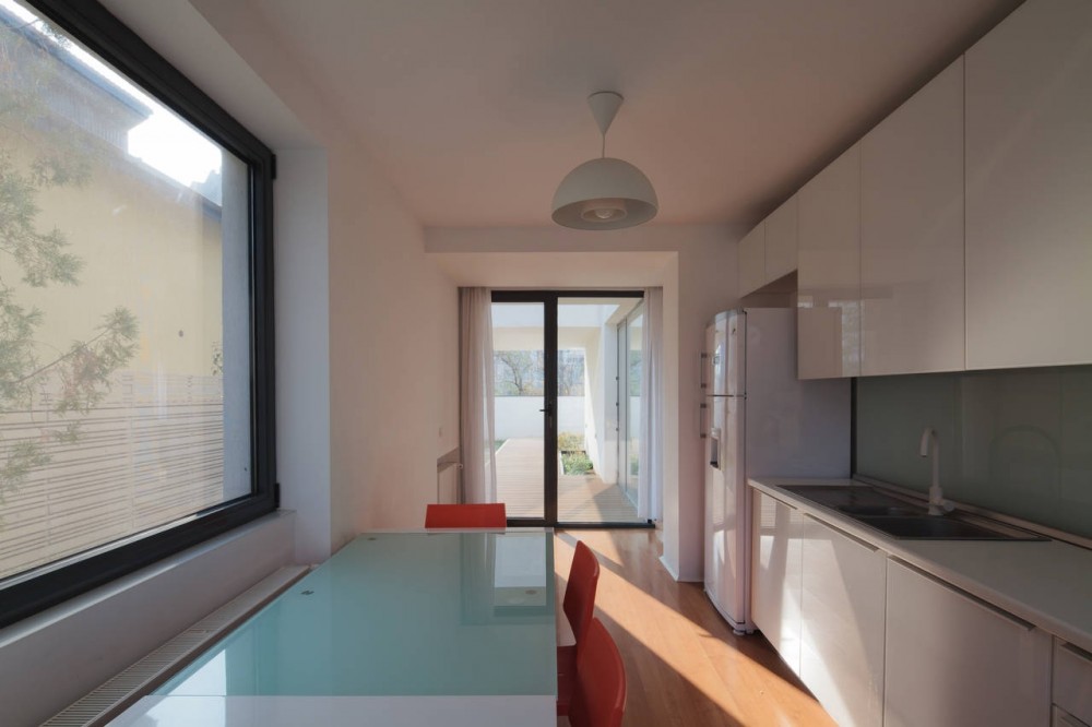 Tavanul din beton aparent al livingului, placarile cu sticla vopsita ale bailor, balustrada de sticla a scarii prinsa doar in cantul placii de beton, mobilierul la comanda incastrat si disimulat in culoarea peretelui, spatiile deschise, fluide illuminate natural, sunt solutii accesibile care odata acceptate isi dezvaluie atuurile, dand viata interiorului.