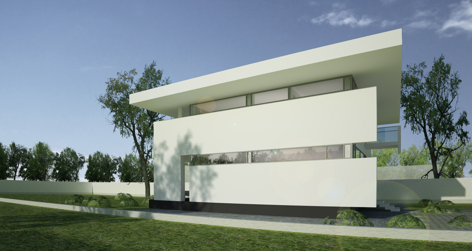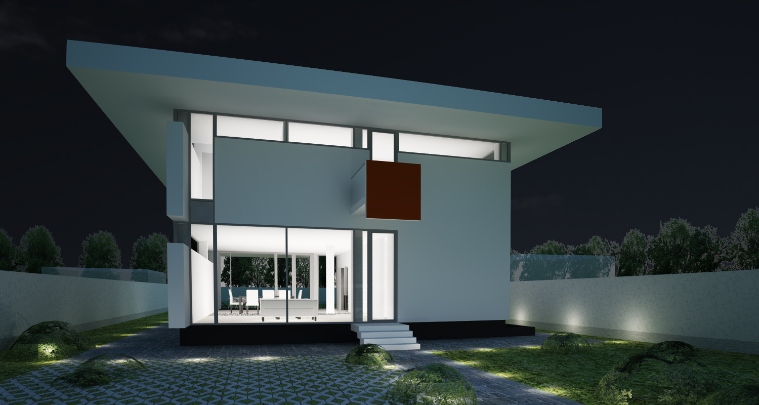 In cromatica fatadei de acces dinspre strada s-a optat pentru un accent de culoare, concretizat in placarea cu sticla colorata a parapetului de la balconul biroului/bibliotecii de la etaj. In acelasi timp, acest balcon minimal se constituie si intr-o copertina peste zona de acces in casa.