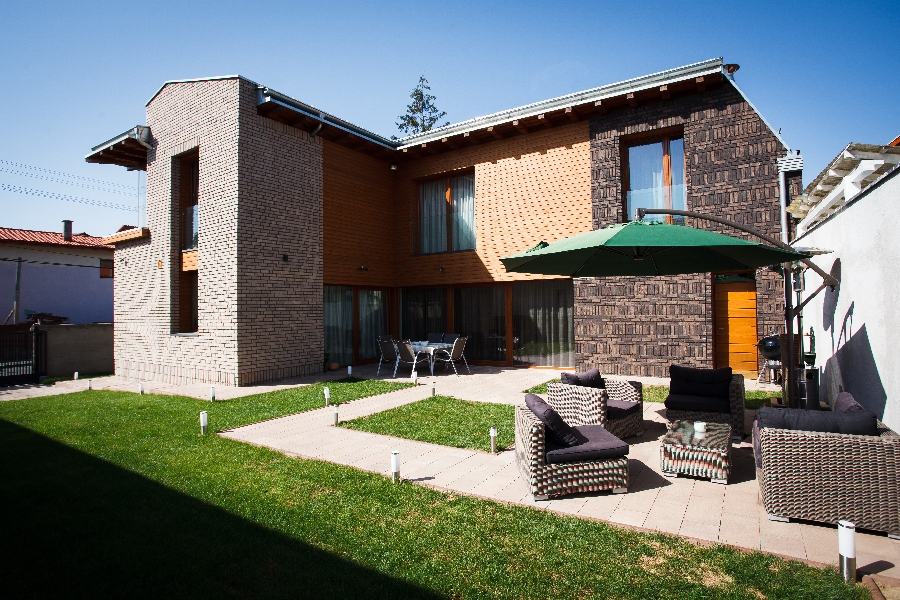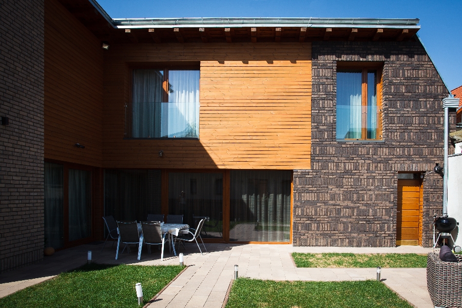 Dacă imaginea spre spaţiul public este tratată sobru prin aplicarea cărămizii, zona curţii interioare, a terasei este considarată zona caldă, familială unde lemnul este preponderent. Majoritatea spaţiilor interioare de la etaj si parter sunt orientate spre aceasta.
