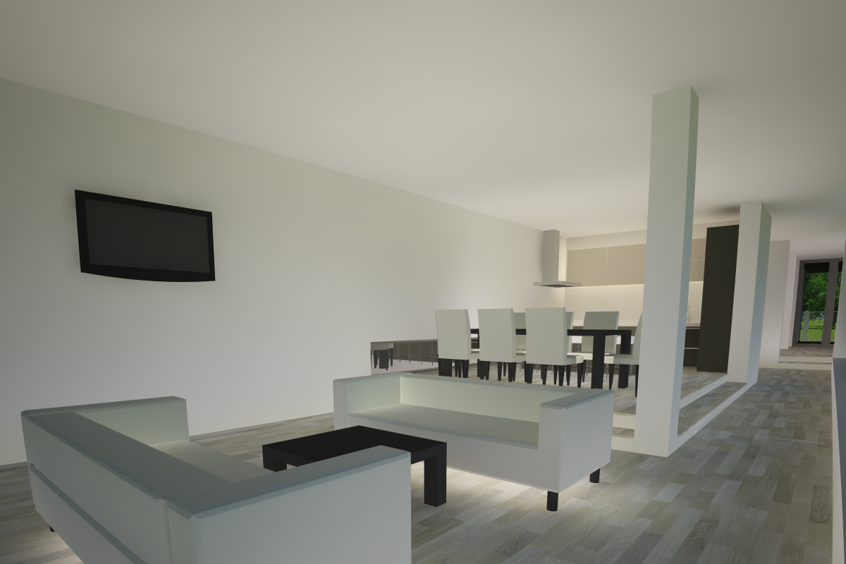 Astfel, zona de zi este vitrata din plin, zona de bucatarie si loc pentru luat masa este gandita ca un mini show-room, iar partea de living este ingropata cateva trepte sub nivelul casei. De asemena zona de scara este gandita ca un spatiu care se prelungeste in etaj si care se deschide la ambele nivele.