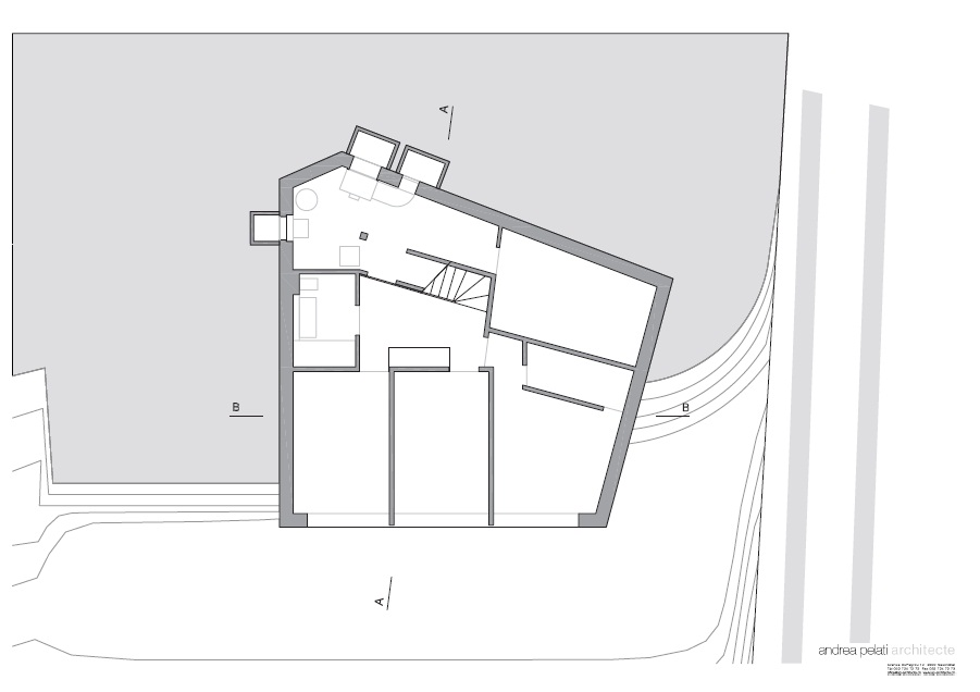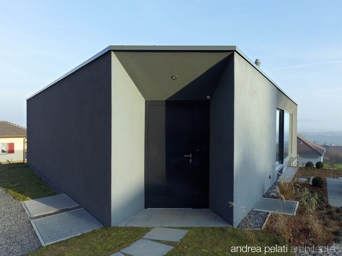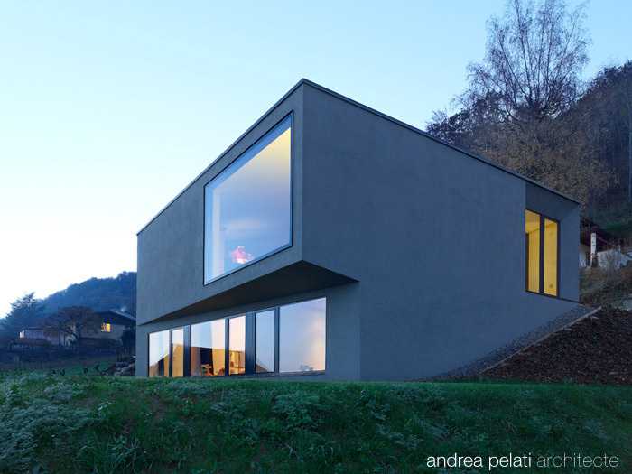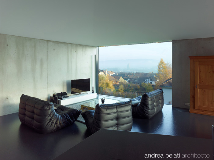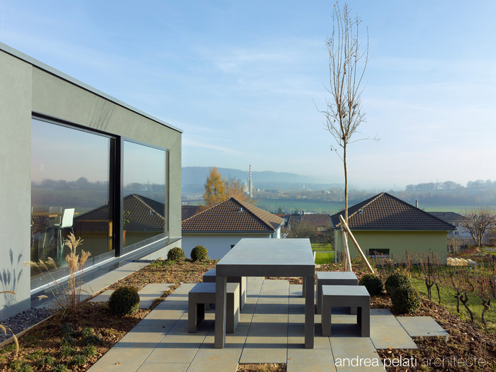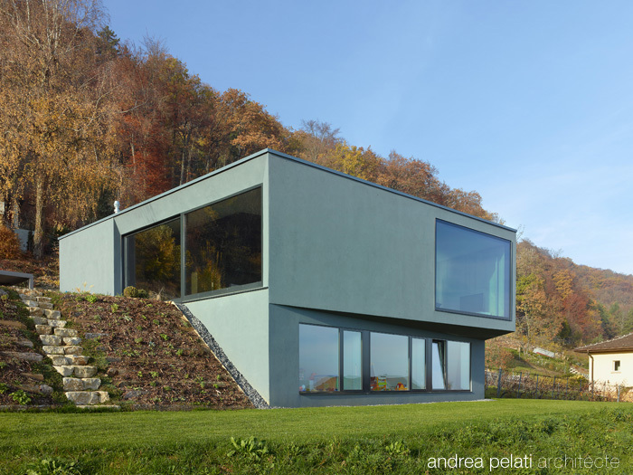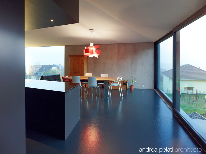 Marginita de un vechi zid din piatra si de o plantatia de vie, casa este amplasata pe un teren in panta ce prezinta o priveliste frumoasa spre localitatea Cornaux, Elvetia. Acest mediu si forma terenului contureaza planul si volumetria casei. Zonele mari vitrate sunt puse in evidenta in contrast cu masivitatea locuintei.