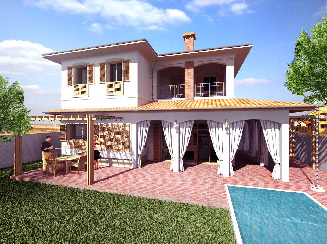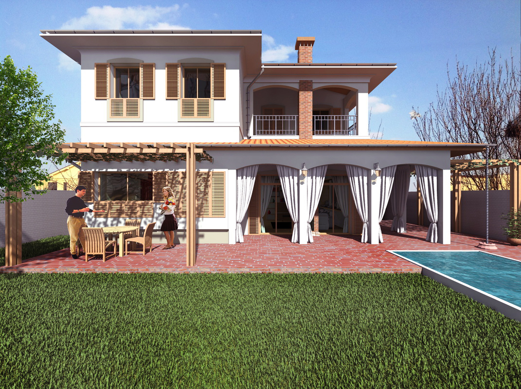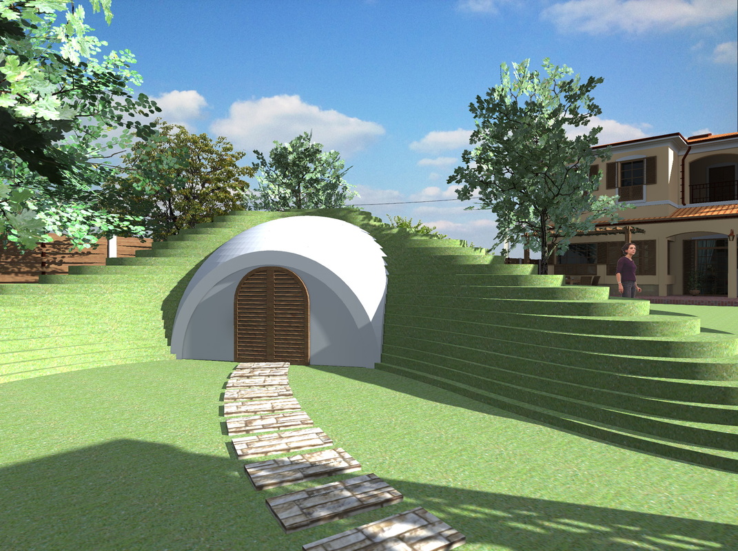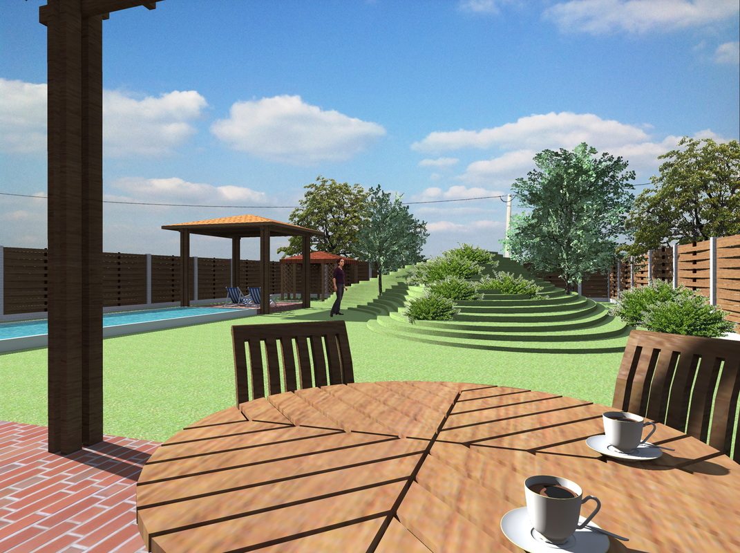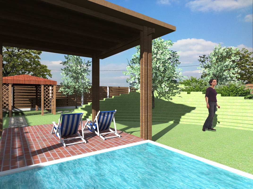 Zona camerei de zi are parte si de o terasa generoasa acoperita, amplasata spre sud, de unde se poate ajunge rapid in piscina racoritoare. O piscina ingusta, dar lunga strict pentru cateva ture de inot. La capatul piscinei se mai afla un foisor de unde pe o alee se poate ajunge la zona de gratar si micul beci tip „hobbit house” ascuns si acoperit de un deal de pamant.
