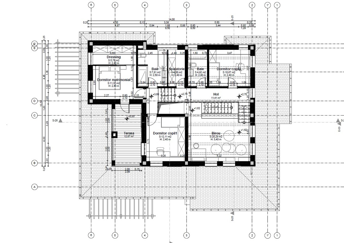 Din zona garajului se poate ajunge in holul de acces al casei. De aici se poate patrunde fie in zona de servire a mesei, bucatarie, camera de zi, dar si urcand cateva trepte in zona de birou/studio de pictura ce se afla deasupra de garaj. Aceasta zona este punctul inalt de unde se poate arunca o privire atat in living prin biblioteca inalta ce separa cele doua spatii, spre zona de servit masa, dar si spre dormitoarele copiilor. Zona de noapte este accesibila la o alta cota fata de birou/studio de pictura. Aici se afla camerele copiilor, baile, spalatoria iar in continuarea lor se afla dormitorul matrimonial cu terasa proprie spre gradina.
