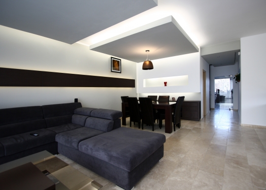 Parterul casei este ocupat de spatiul tehnic, depozitari si zona de zi: bucatarie , camera de zi , iar la etaj se afla un birou si zona de noapte: doua dormitoare cu dressing si baie proprie.