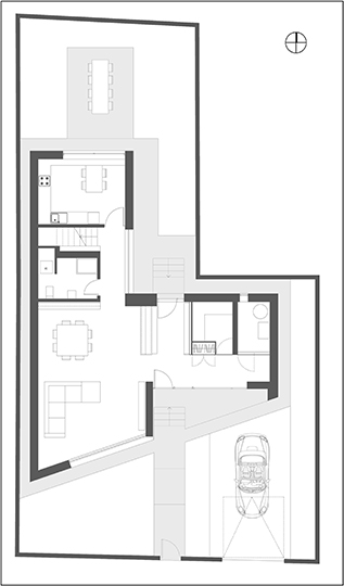 Toate acestea: contextul, forma terenului, dimensiunile acestuia si tema data de beneficiari au generat o casa simpla, mica, în care fatada de la strada se roteste catre o însorire cat mai favorabila (Sud-Est) si face loc, prin retragerea oblica fata de strada, locului de parcare.