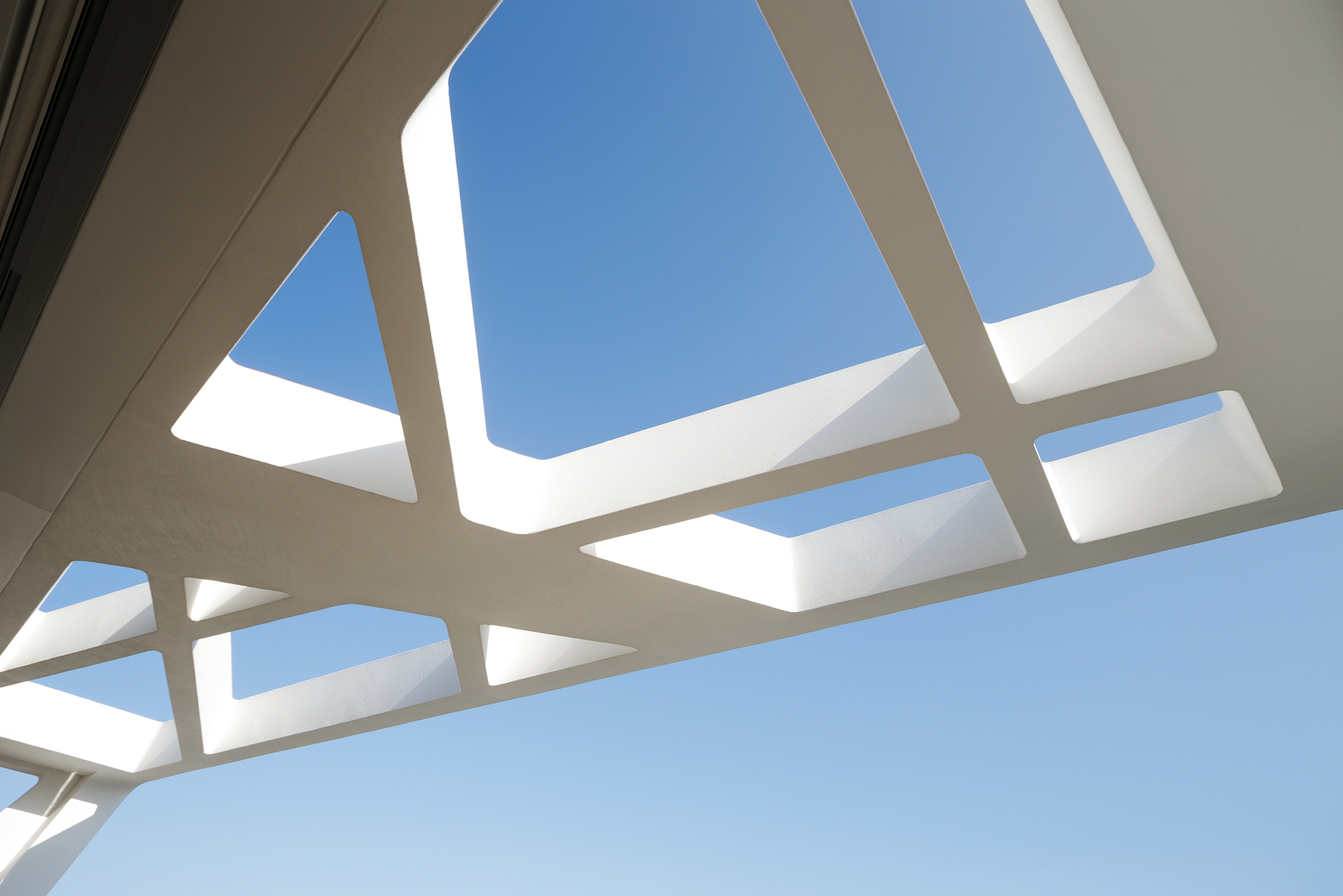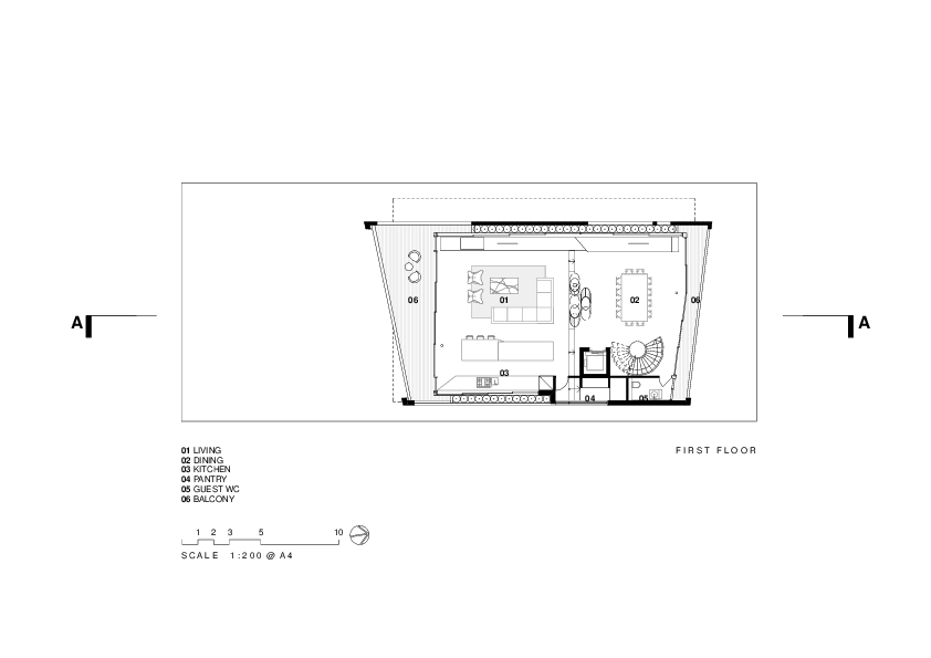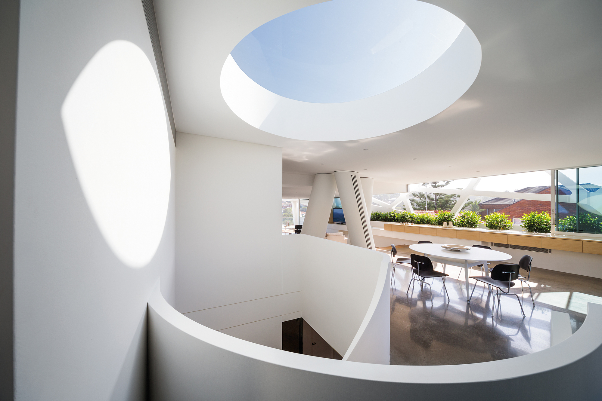Zona de zi si locul de luat masa au fost amenajate la ultimul nivel, pentru a beneficia de perspective si de lumina. Avand spatii deschise, volumul este definit prin vitraje mari catre nord si sud astfel incat lumina soarelui si briza marii sa poate strabate toata casa.