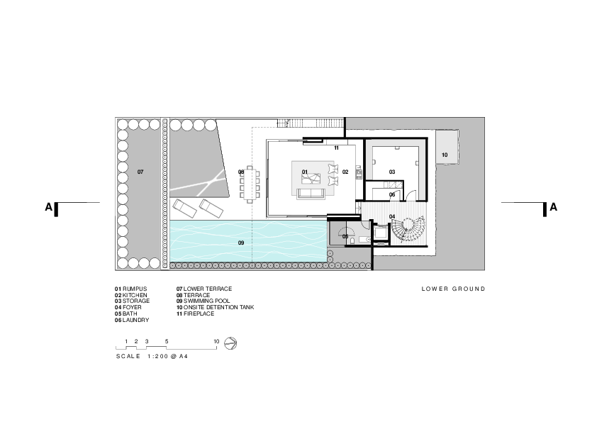 La parter au fost amenajate patru dormitoare, pozitionate putin retras pentru a beneficia de liniste si intimitate. O scara in spirala conduce catre o a doua zona de zi amenjata la nivelul cel mai de jos, care se deschide catre gradina si zona piscinei.