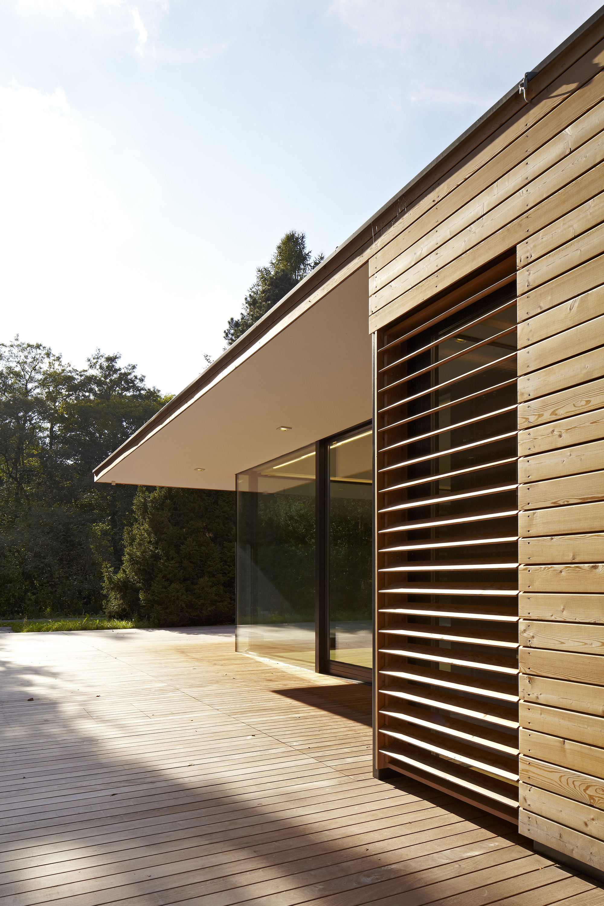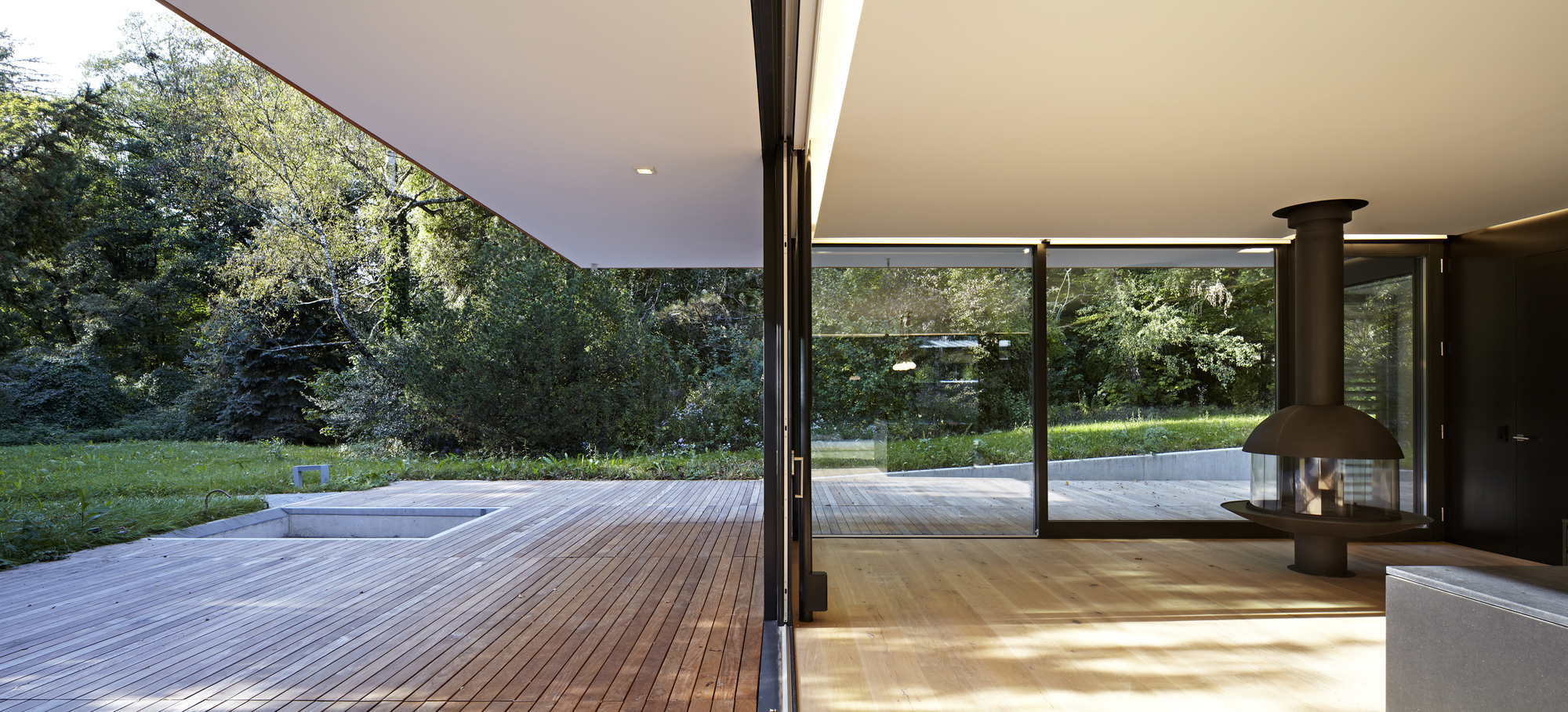 Zonele mari vitrate aduc gradina spre interior, iar cu ajutorul usilor glisante zona interioara se poate deschide complet spre terasa/exterior.Acoperisul se extinde de-a lungul terasei , oferind umbra spatiului interior , dar si permite utilizarea terasei , chiar si in zilele ploioase, si creeaza o zona mare de relaxare in legatura directa cu livingul cu o vedere panoramica spre gradina.