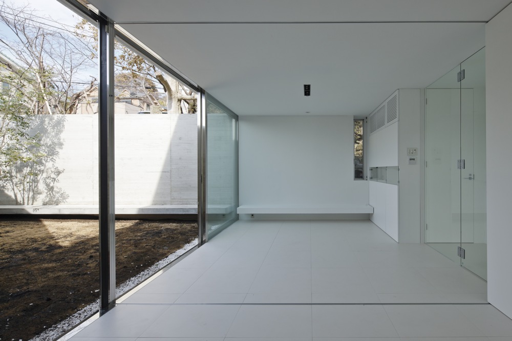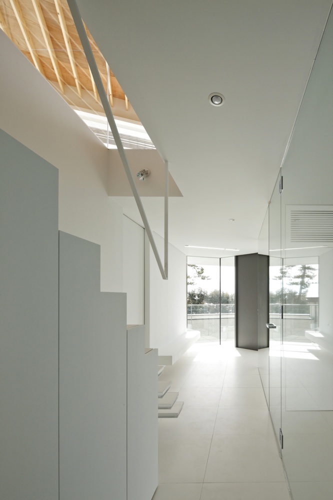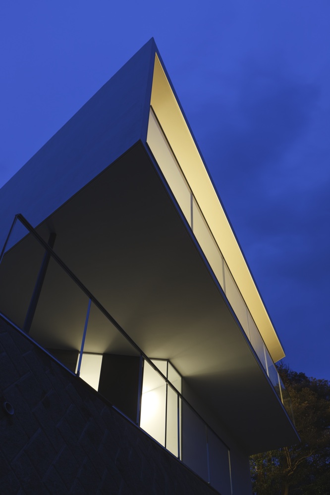 Casa este compusa din volume dreptunghiulare cu baze din beton pentru care a fost ales un pigment fotocatalitic alb aplicat.Aceste volume sunt decalate pentru a crea un efect de suprapunere ce transmite o sensibilitate moderna in timp ce incorporeaza un anumit estetic oriental. Pe masura ce coboara panta ingusta spre ocean , pilotii triunghiulari de la intrare isi fac prezenta in priveliste. Copacul memorial plantat in curtea exterioara in afara primului etaj unde se afla atelierul, asigura un oarecare grad de intimitate.