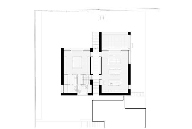 Prin urmare, fiecare volum are o functiune anume fiind situat la inaltimi diferite. Intrarea comunica direct cu camera de zi spatioasa care se termina spre nord cu o terasa generoasa, marcata de un cadru ce inrameaza vederea spre zona inconjuratoare. La urmatorul nivel se afla zona dormitorului, iar de aici se poate ajunge la ultimul volum ce este caracterizat prin suprafete mari vitrate si adaposteste o zona de studiu si relaxare.