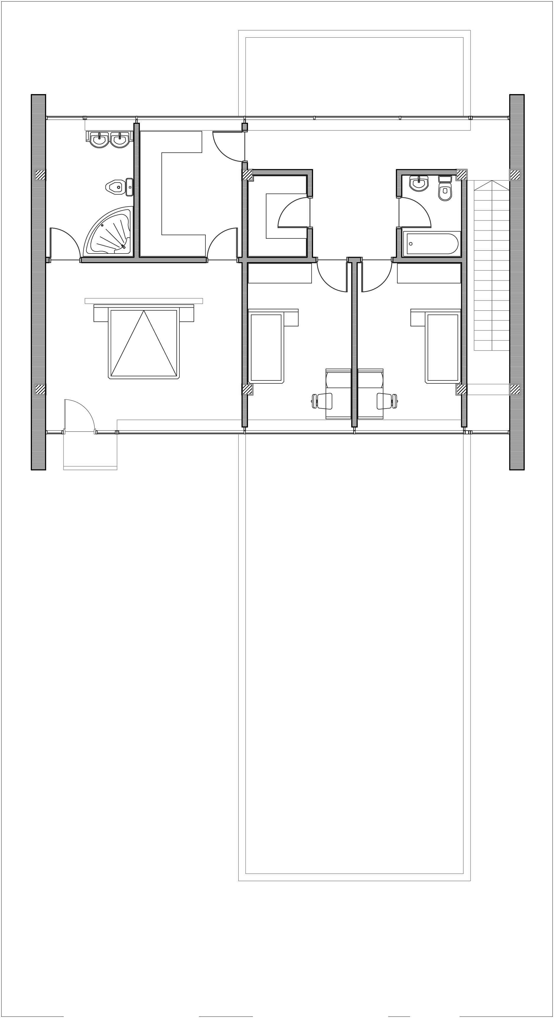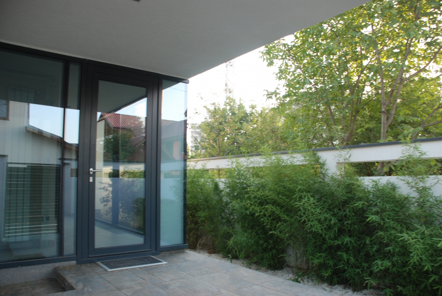 O parte importanta a solutiei agreate cu beneficiarul a fost reprezentata de o terasa generoasa acoperita. Prin delimitarea sa putin sesizabila de zona livingului, realizata cu spatii vitrate cu deschideri largi, terasa preia in anotimpurile calde, indiferent de zile insorite sau deopotriva ploioase, functia de spatiu de relaxare a livingului.