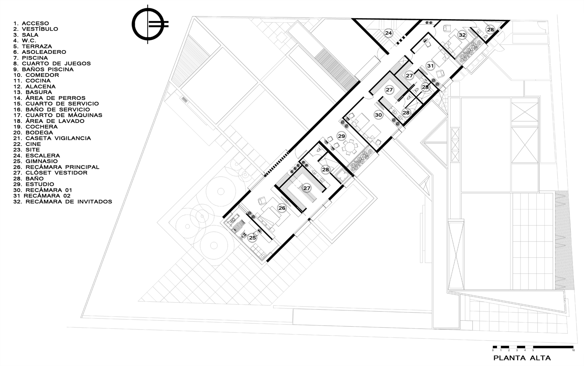 In cele din urma, pentru a consolida conceptul, coridorul a fost impartit in doua sectiuni. Primul este situat intr-un volum solid aflat in consola deasupra solului; adaposteste zona privata si adaposteste domeniul social, cuprins de o serie de terase la diferite niveluri pentru a defini o ierarhie spatiala.