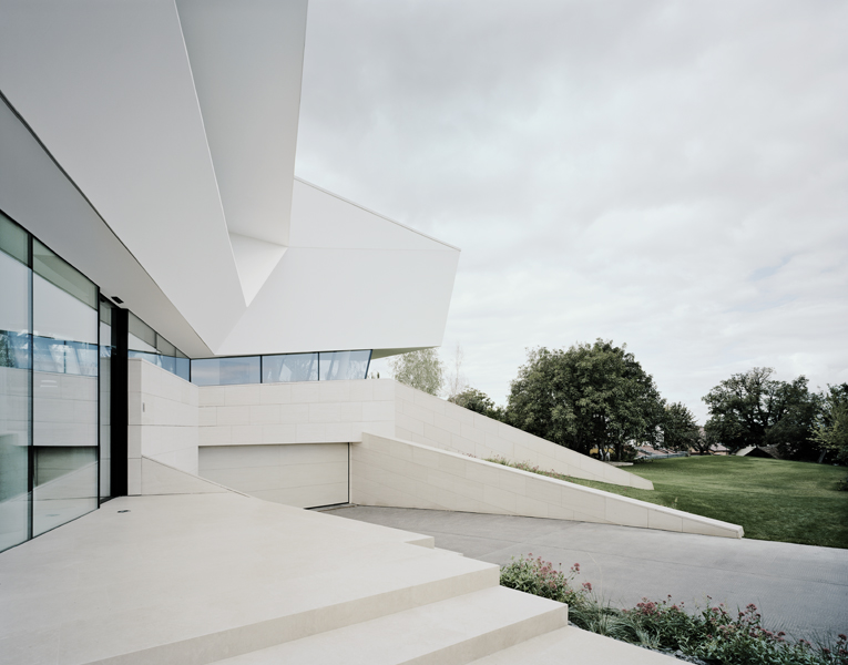 A monolithic residence has been built for a young family in a village close to Vienna. On an exposed hillside plot the residential building is positioned as a solitaire. The sculptural object is surrounded by a generous garden designed by the owners gardening company. The spacious garden merges into the surrounding fields and the natural site. The main body of the building consists of two mutually shifted elements which follow the slope from north and south. By the horizontal displacement a high air space, forming the entrance and the central opening, is produced between the elements.