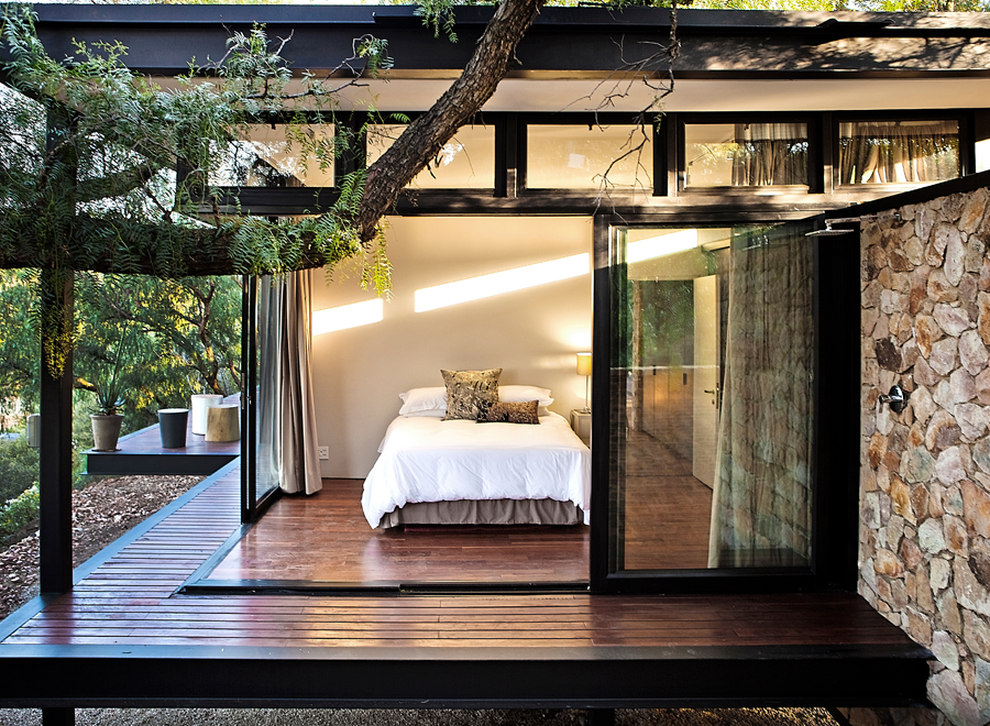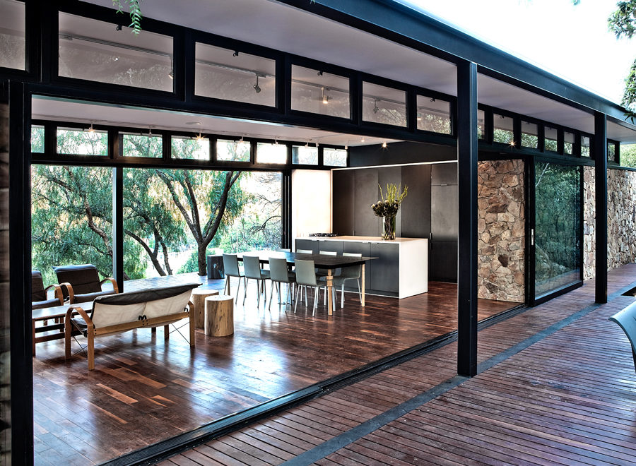 Second, from an environmental perspective, architects Georg van Gass and Clare Eisenstein wanted to treat the ecosystem of the Westcliff Ridge very lightly, with low impact on its surrounding. The goal was to allow the building to float above the ground plane, leaving as much of the ridge intact as possible; the only disruption to the ground being the footings of the main structural steel columns. The third reason that a steel frame structure was chosen was a visual one. Simply put, Georg van Gass and Clare Eisenstein wanted an elegant, timeless aesthetic that would allow the use of steel elements not only as primary structural elements, but also as the principal architectural motif. This also allowed the incorporation of sprung solid timber floors that blended seamlessly with the exterior solid decking, while still retaining the straight, elegant steel edge detail.