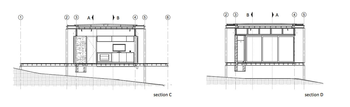 From its hiding place on the edge of the cliff this steel framed pavilion is constructed primarily from I-sections for beams and square hollow tubes for columns.