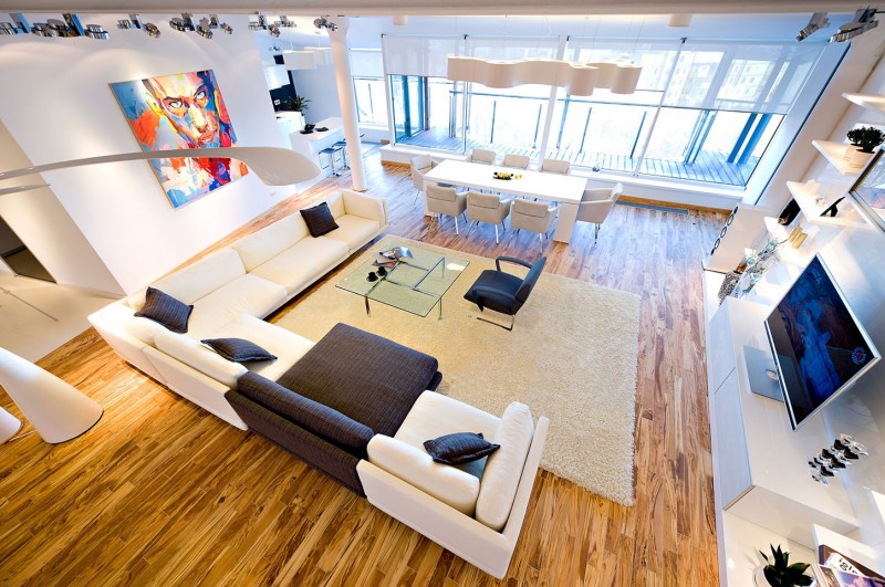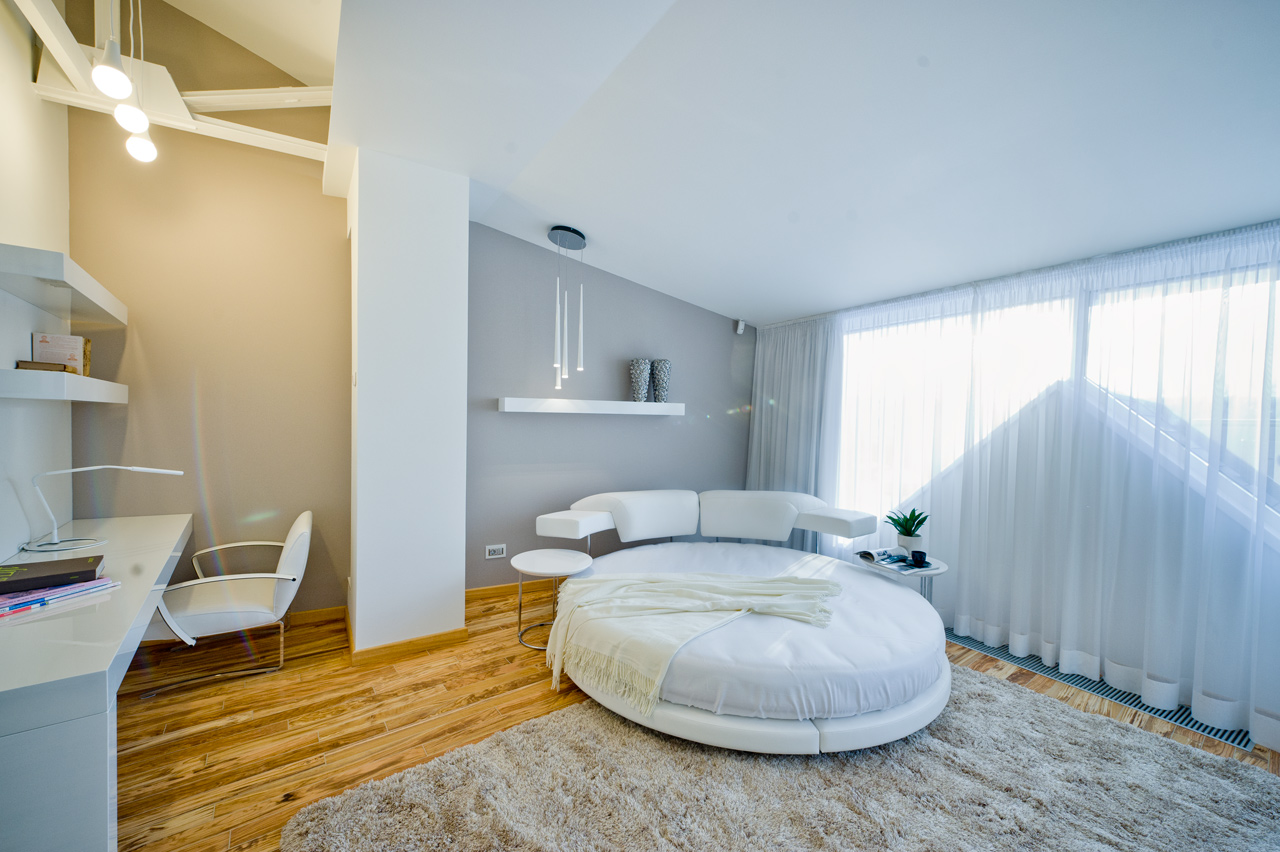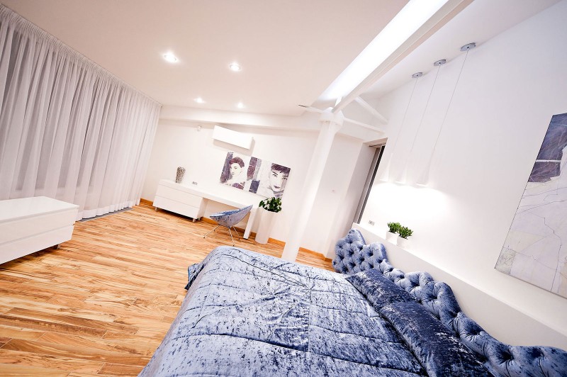 Un apartament spectaculos cu o amenajare de interior proiectata de Grosu Art Studio in capitala Moldovei, Chisinau si amplasat la ultimul nivel al unei noi cladiri de locuinte . Se observa cum in toate spatiile , livingul generos ce se imbina armonios cu locul de luat masa si bucataria, dormitoarele simple dar elegante , chiar si in bai, domina albul in contrast cu textura parchetului si cu mobilierul ales. Fotografiile vorbesc de la sine si redau perfect calitatea vietii interioare oferita.
