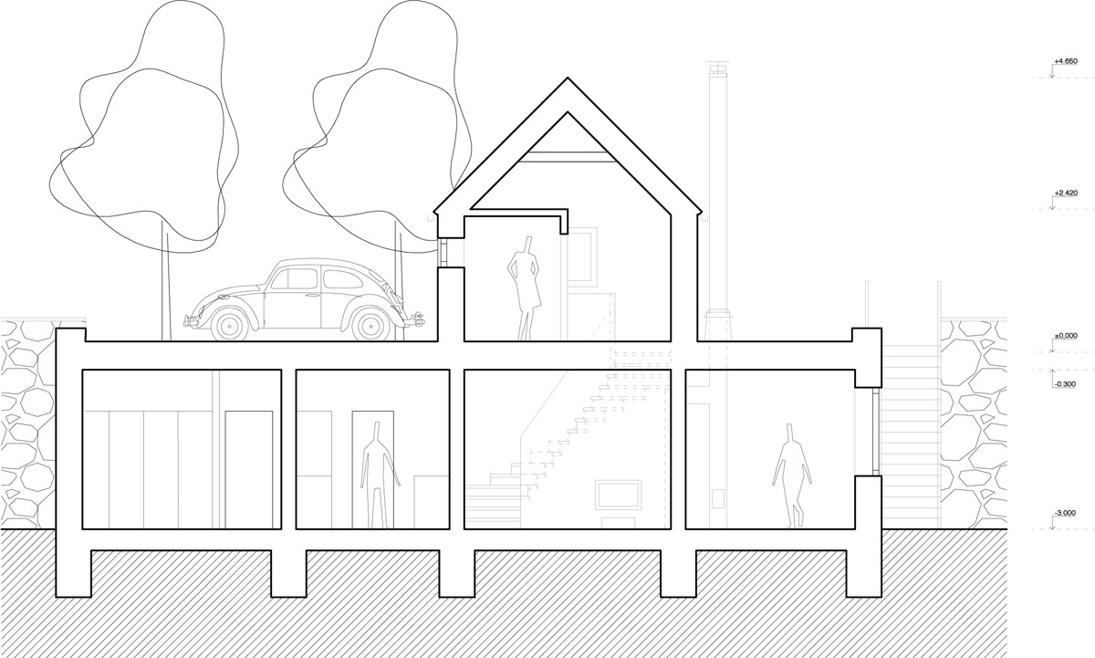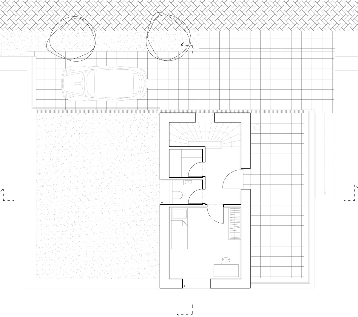 Cererea clientului a fost realizarea unei case mici pe un teren mare rezultand o cladire cu doua etaje in cazul in care marea majoritate a spatiului de locuit este situat la etajul inferior in contact direct cu terasa si gradina.