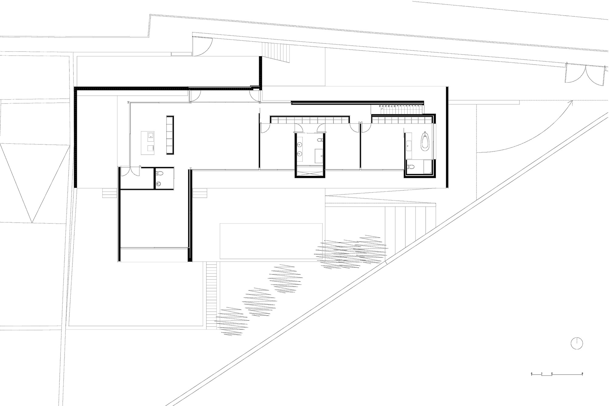 Din terenul triunghiular se formeaza o arie naturala in forma de “L”. Cu 7 m panta si pereti din granit existenti a fost realizata o platforma de 2 m sub nivelul strazii.
