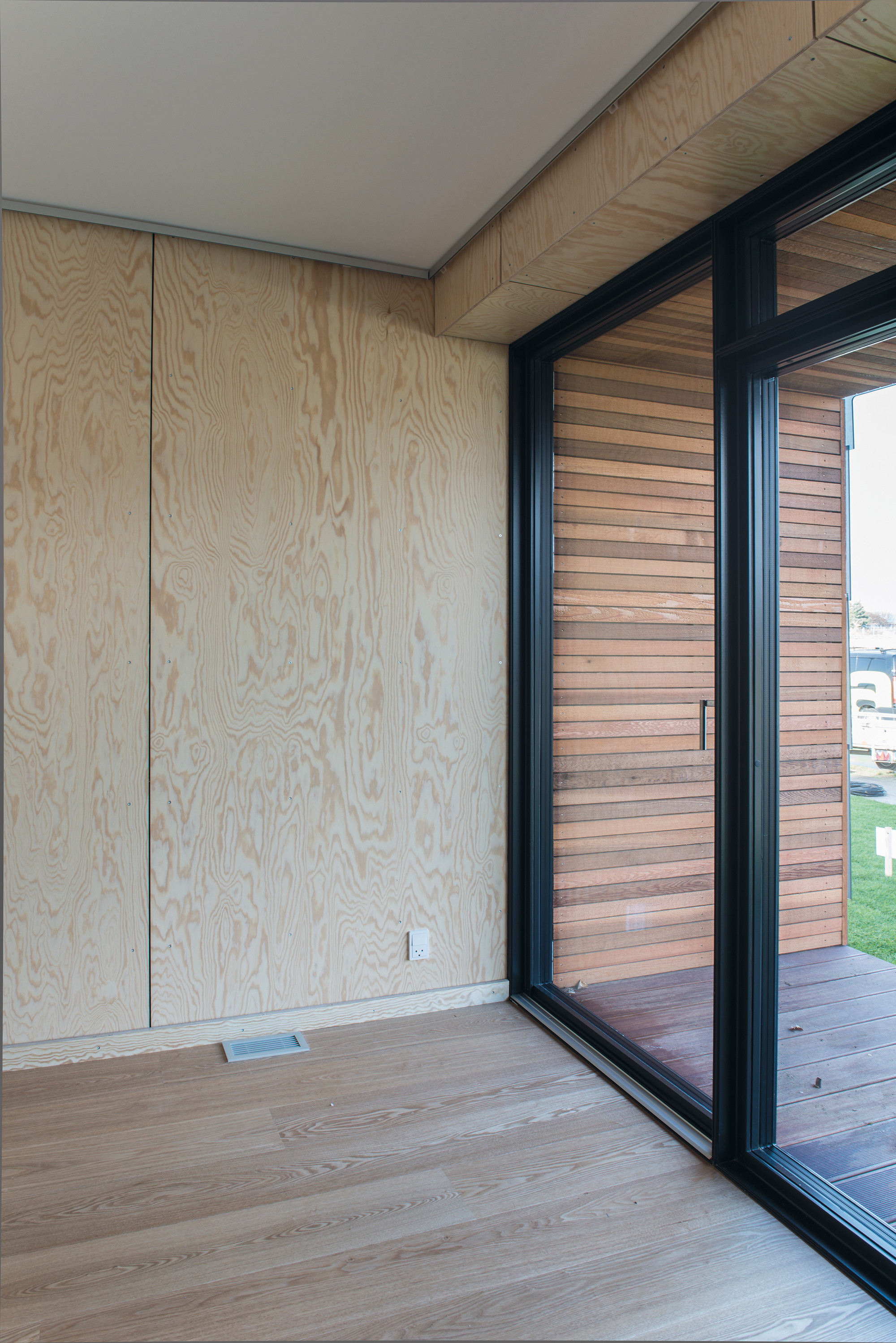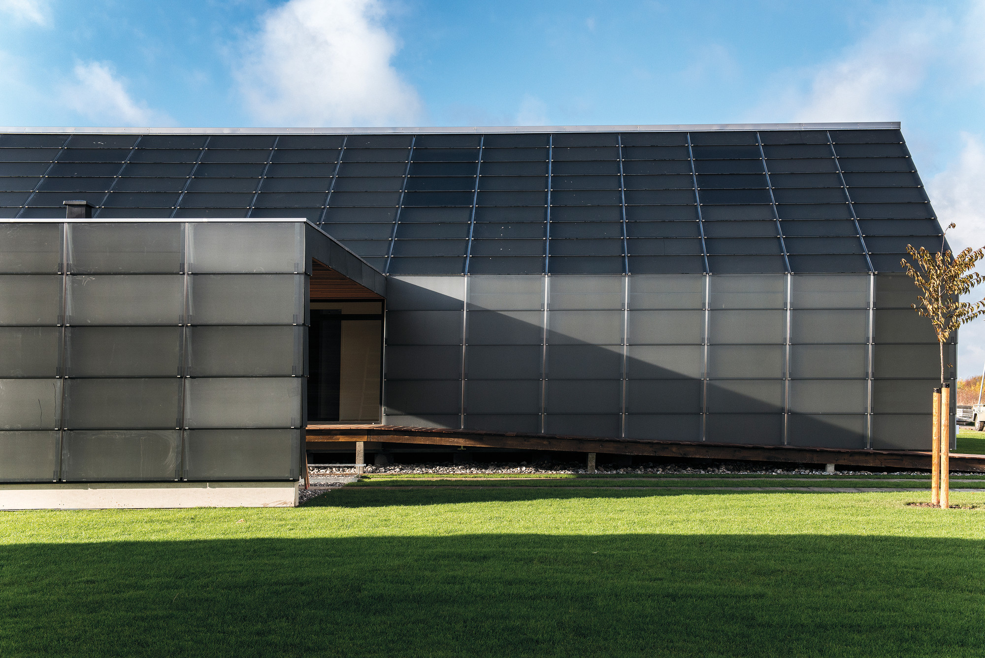 Casa este echipata cu un “scut de sticla” care se incadreaza in jurul acoperisului si a intregii fatade a cladirii, protejand constructia sa din lemn de ploaie si vant. Scutul este din sticla reciclata si, in principiu, este indestructibila. Scutul este format dintr-o suprafata continua, neintrerupta de conducte de ventilatie – asigurand din nou o viata prelungita prin evitarea scurgerii pe la articulatii. Toate ferestrele si usile sunt trase inapoi de la fatada si sunt situate in nise adanci care ofera protectie eficienta impotriva fortei naturii.