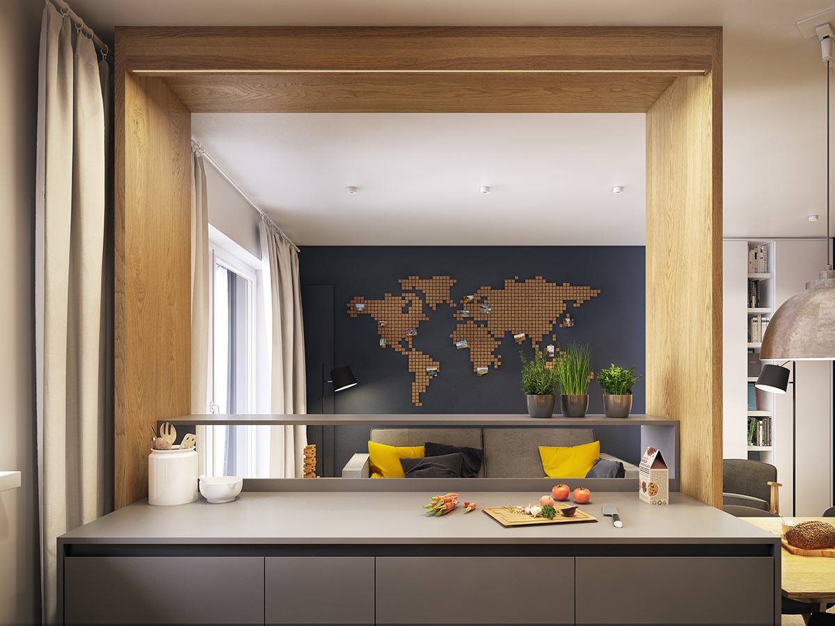 Sa va uitati atent la corpul de mobilier ce separa cele doua spatii, cat de elegant si functional este in acelasi timp. Daca zona de zi se bucura de un gram de design traditional, holul de intrare marcheaza trecerea la un stil modern si experimental. In dormitor regasim stilul din living si se pune accent pe contrastul intre nuantele de gri si textura lemnului natural.