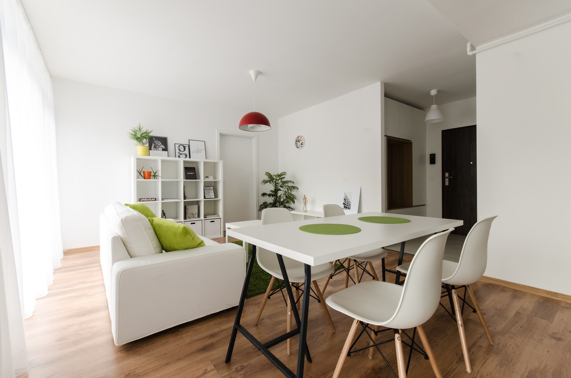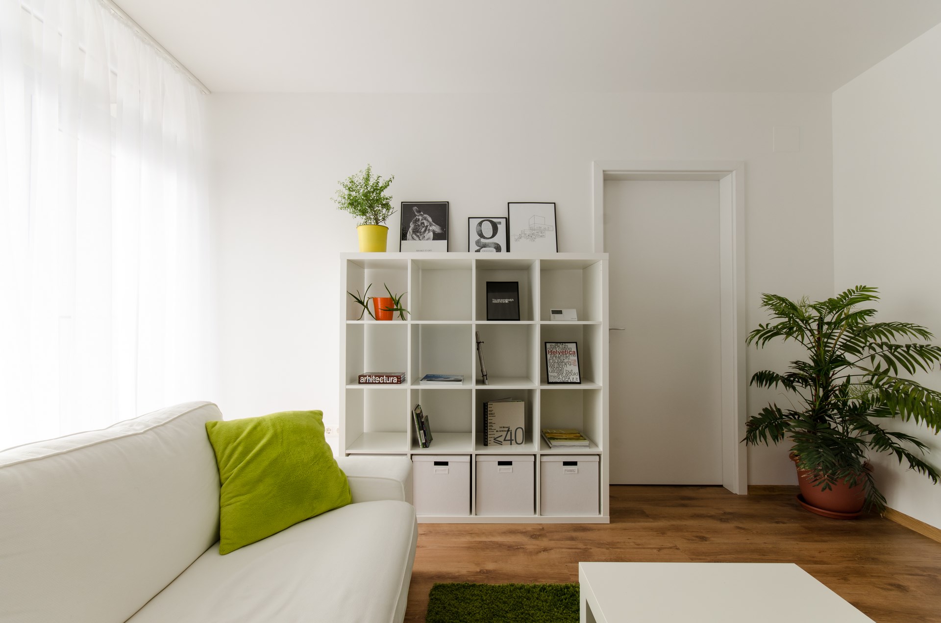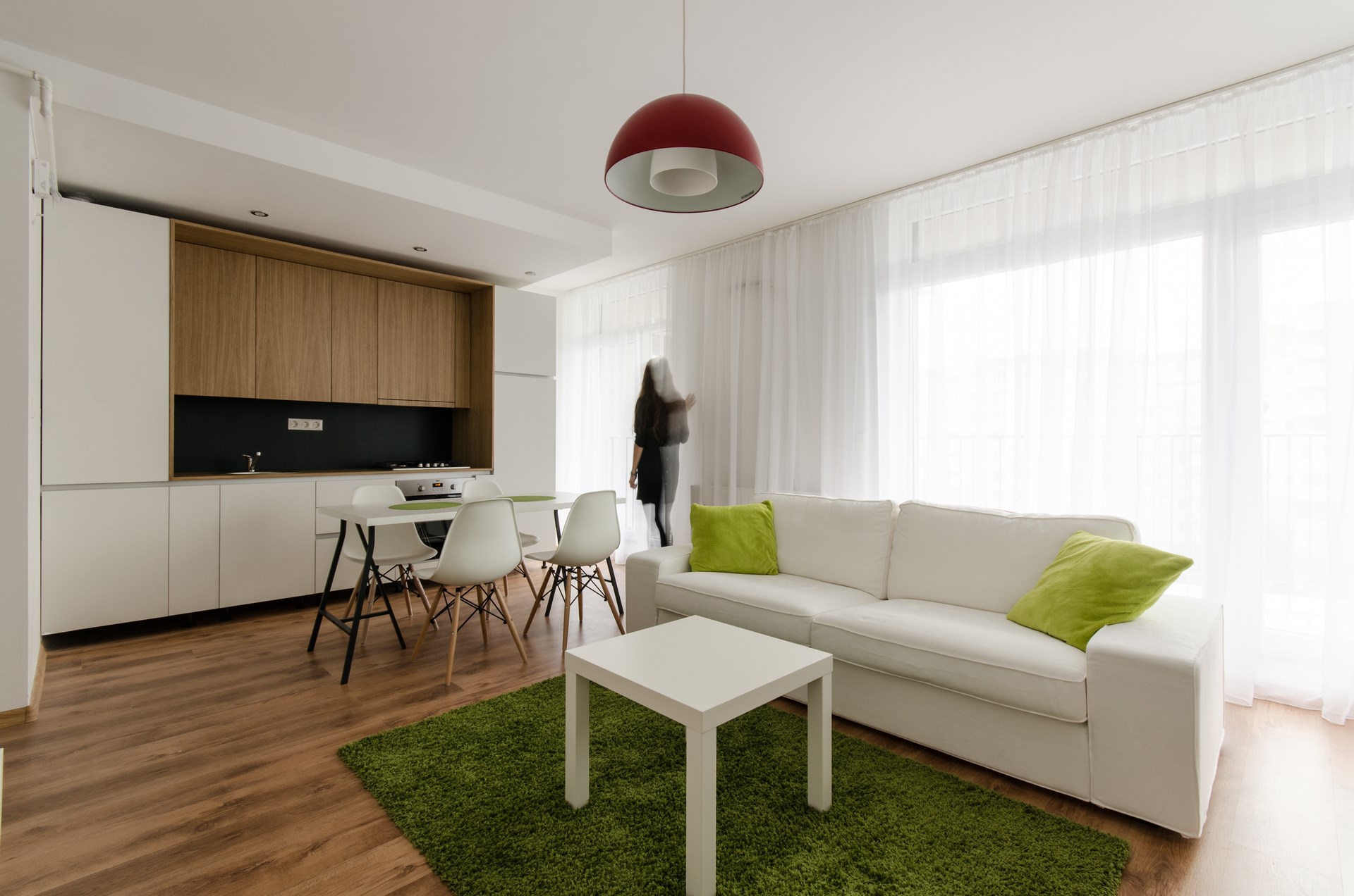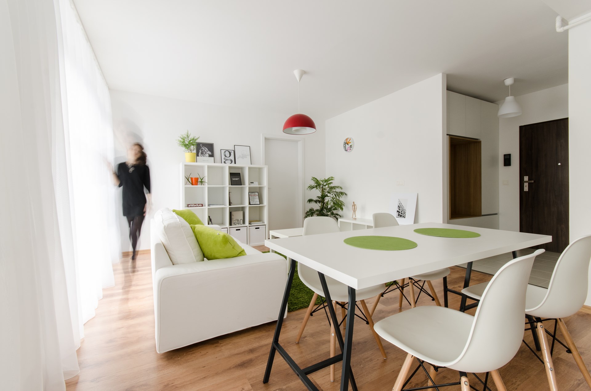 Apartamentul are 48 de metri patrati, iar cu ajutorul ferestrelor mari spatiul se deschide catre exterior si permite luminii sa puna in valoare interiorul. Perdelele si mobilierul de culoare alba reflecta si imprastie lumina naturala in toata locuinta. Mobilierul simplu nu incarca spatiul si inglobeaza multe zone de depozitare spatioase. Pe langa albul dominant apare esenta de lemn si verdele care impreuna creeaza un spatiu fresh plin de energie.
