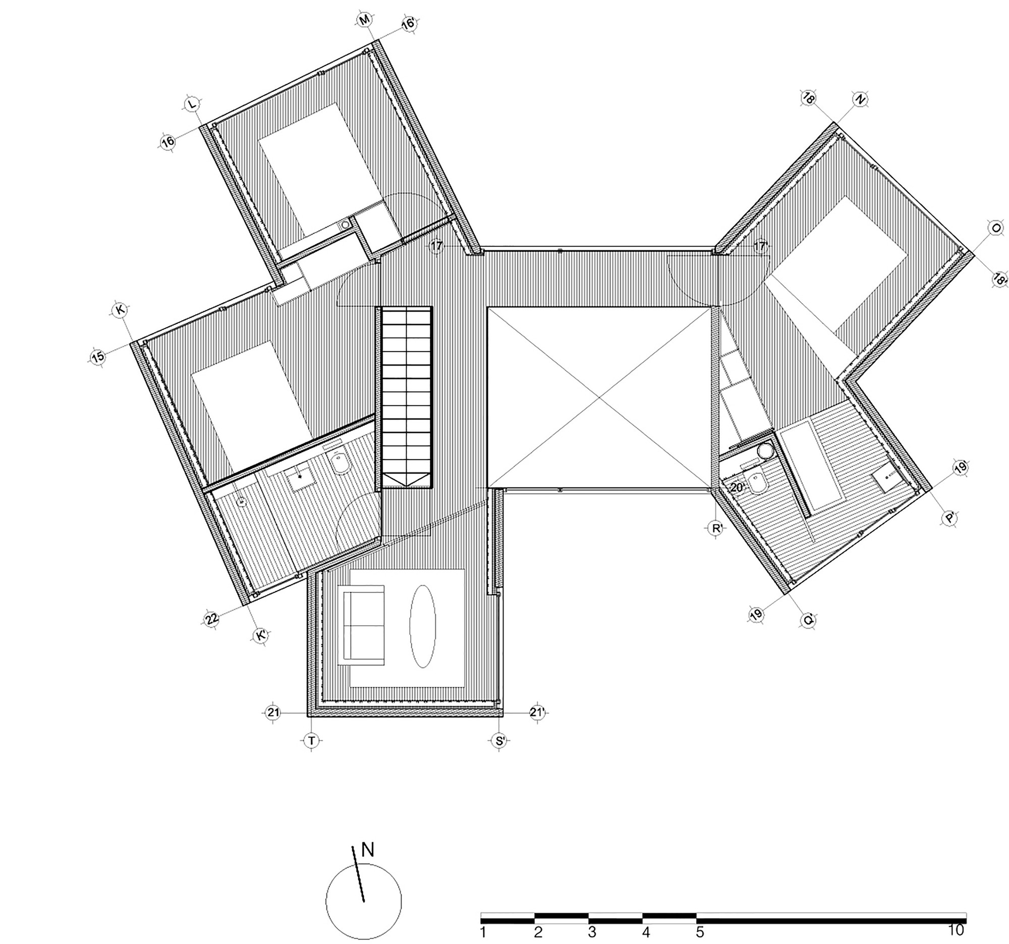 Casa are cinci cuburi pe nivel, puse unele peste celelalte iar fatadele orientate spre mare sunt integral vitrate, sticla folosita fiind una groasa si cu rezistenta sporita la vanturile puternice incarcate cu apa sarata ce vin dinspre mare.