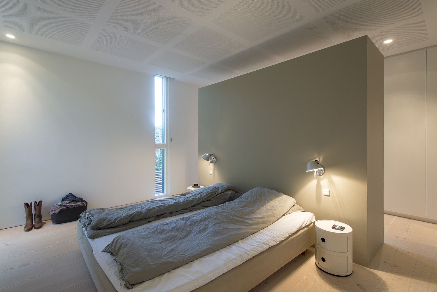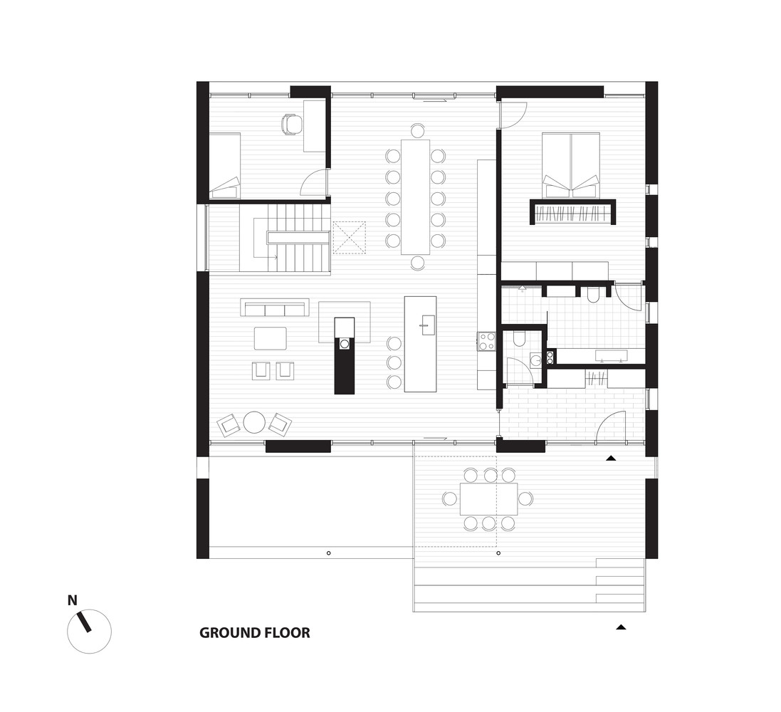 La interior o zona de zi deschisa, care contine bucataria, locul de luat masa si spatiul de discutii ocupa aproape jumatate din suprafata nivelului. Avand in special mobilier monocrom, camera graviteaza in jurul semineului care face o separare vizuala intre bucatarie si spatiul de relaxare. Dormitorul matrimonial este amplasat pe latura de nord-est si beneficiaza de dressing si baie proprie. Arhitectii au reusit sa gaseasca loc si pentru un dormitor de oaspeti amplasat in spatiul de dupa scara ce face legatura cu demisolul.