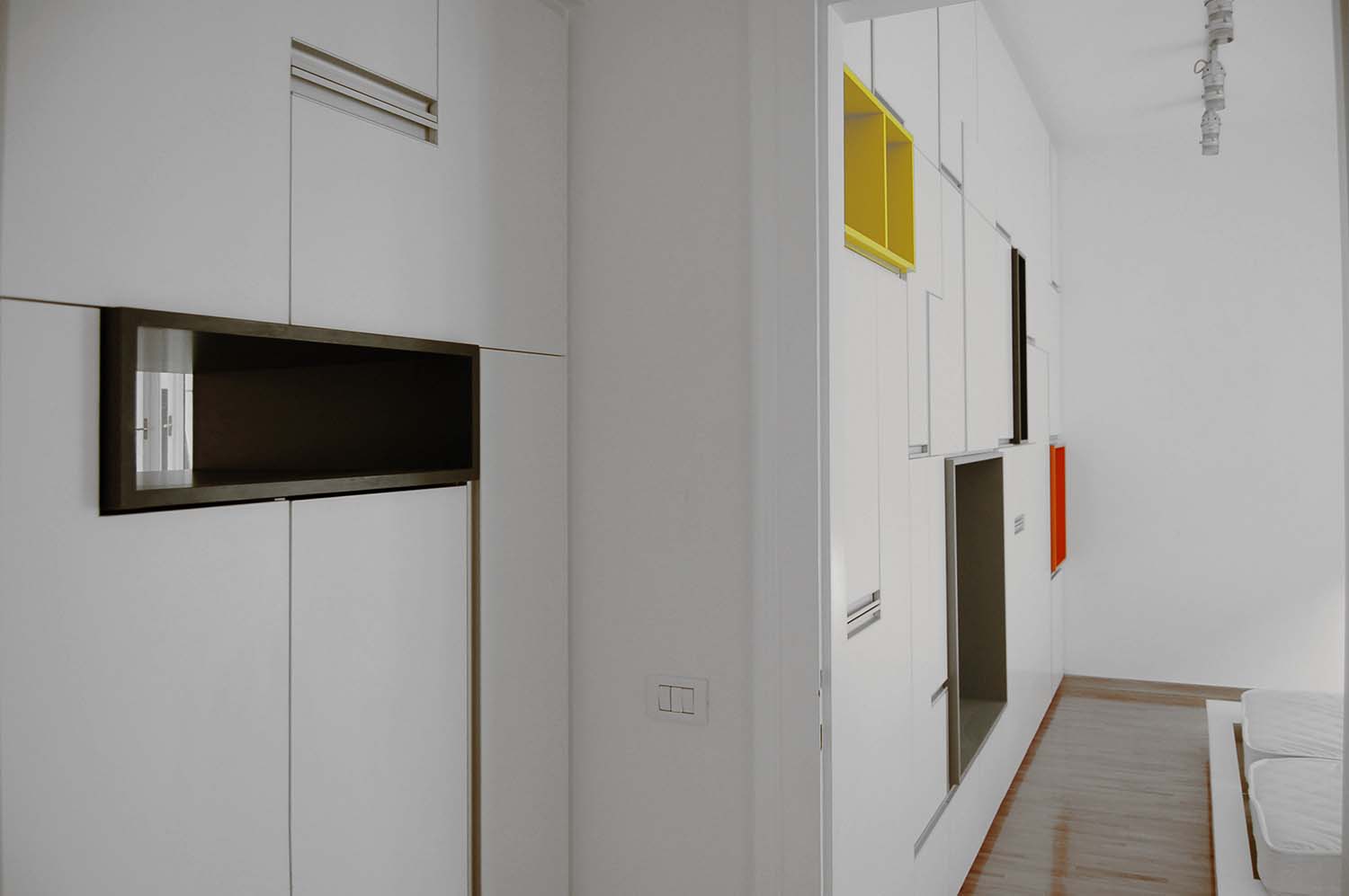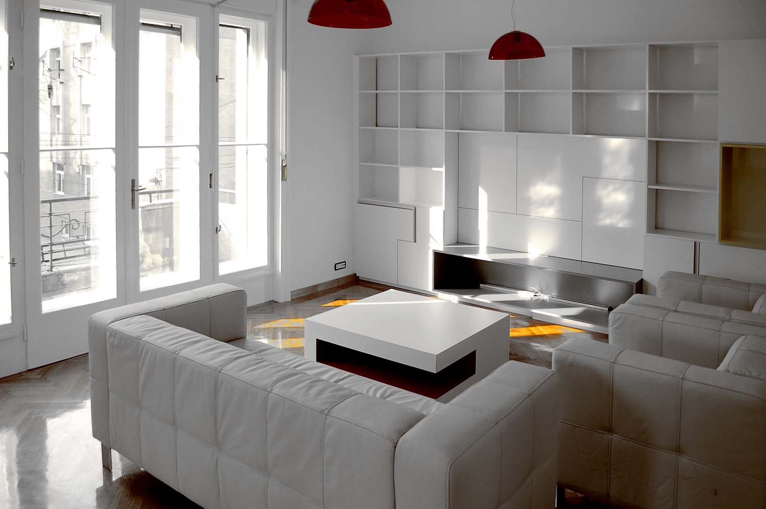 Inca din primele intentii s-a incercat o indepartare de amenajarile devenite “standard” in imobile vechi. Beneficiarul, pasionat de muzica jazz, a dorit un apartament elegant si de standard inalt, flexibil, cu spatii ample multifunctionale in zona de zi. Amenajarea realizata de Parasite Studio a fost conceputa ca o interventie, in care albul este dominant si joaca rolul unui mediu curat si imaculat, unde tema principala a apartamentului consta in dezvoltarea mobilierului tratat ca si o insertie contemporara unitara. Designul surprinde prin latura sa functionala si in acelasi timp estetica, fiind un exemplu de amenajare contemporana nonconformista si spectaculoasa.
