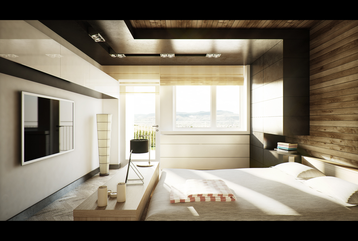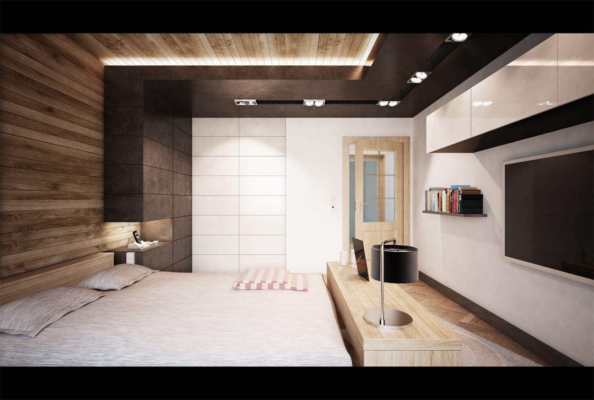 Pentru amenajarea acestui dormitor de 20 m² s-a propus folosirea unor panouri de lemn ce se prelungesc pana pe tavan si continua de-a lungul patului. Efectul impresionant creat de textura acestuia, dar si de spatiile de depozitare ce se extind la randul lor spre tavan, este amplificat de corpurile de iluminat, atent distribuite in interiorul plafonului dar si pe margini.