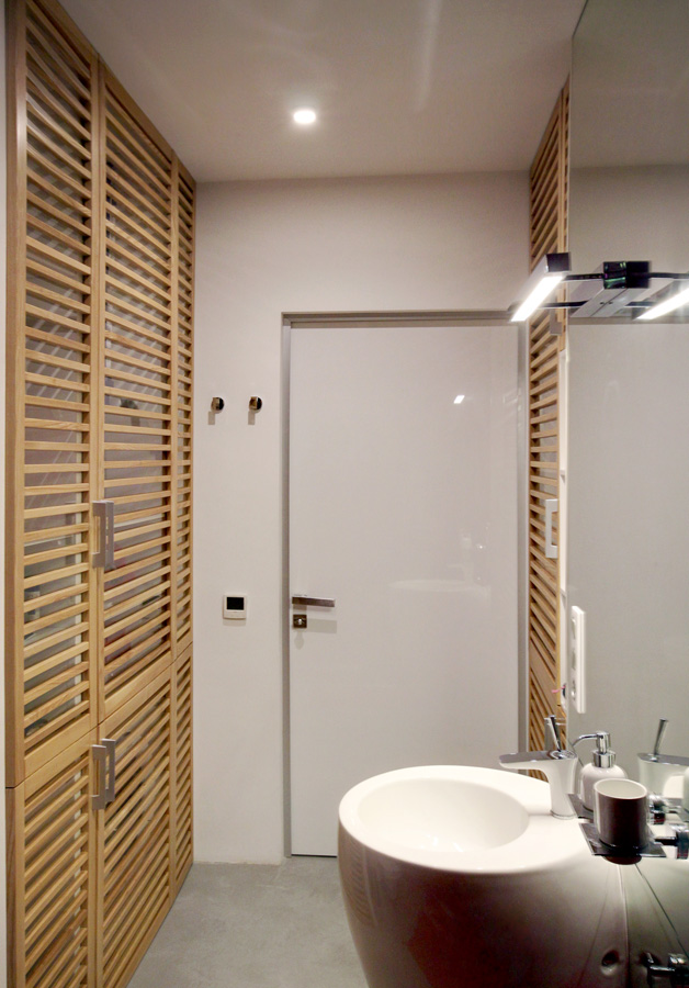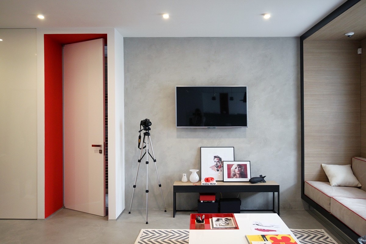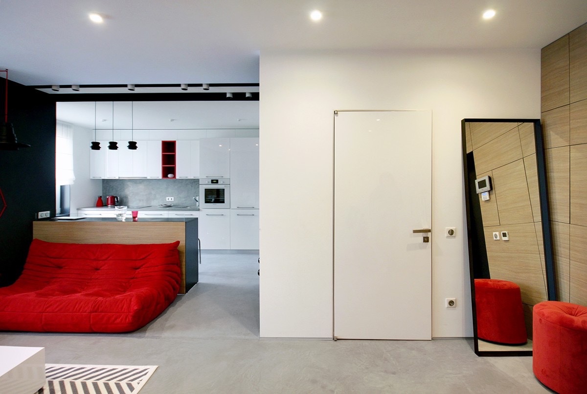 In amenajarea acestui apartament de 55 mp, realizat de designerul Nika Vorotyntseva, accentele de rosu dau viata si personalitate interiorului. La o prima privire apartamentul pare inundat de rosu, mult rosu, dar cand ne uitam mai atenti se poate observa ca doar canapeaua ce se afla in centrul camerei este de un rosu violent, iar in rest apar doar accente de rosu: piesa de iluminat, caloriferul si rafturi in mobila din bucatarie, coltul masutei din living,peretii ce marcheaza usa de acces. Designerul a facut din acest apartament un spatiu al contrastelor, un spatiu potrivit pentru o femeie tanara, dar nu numai 😉