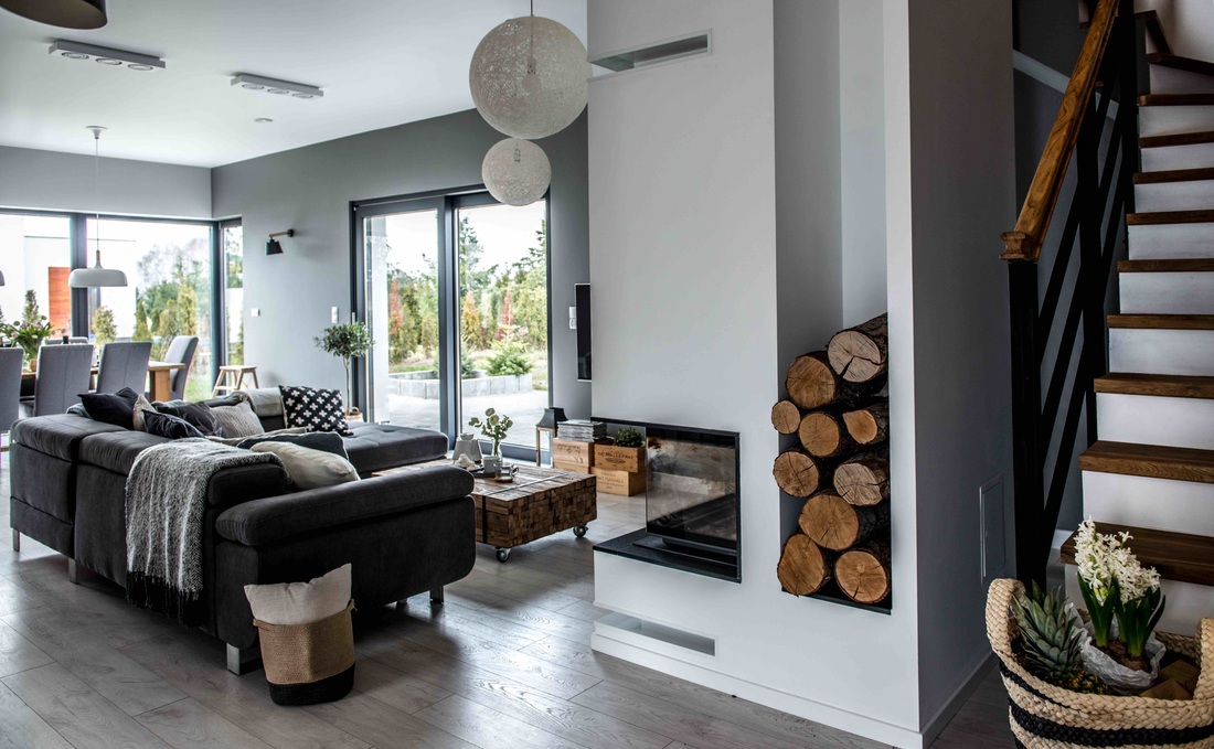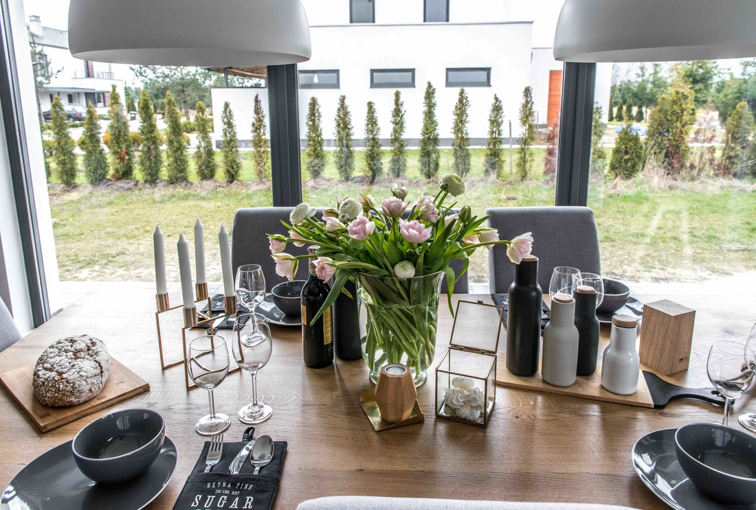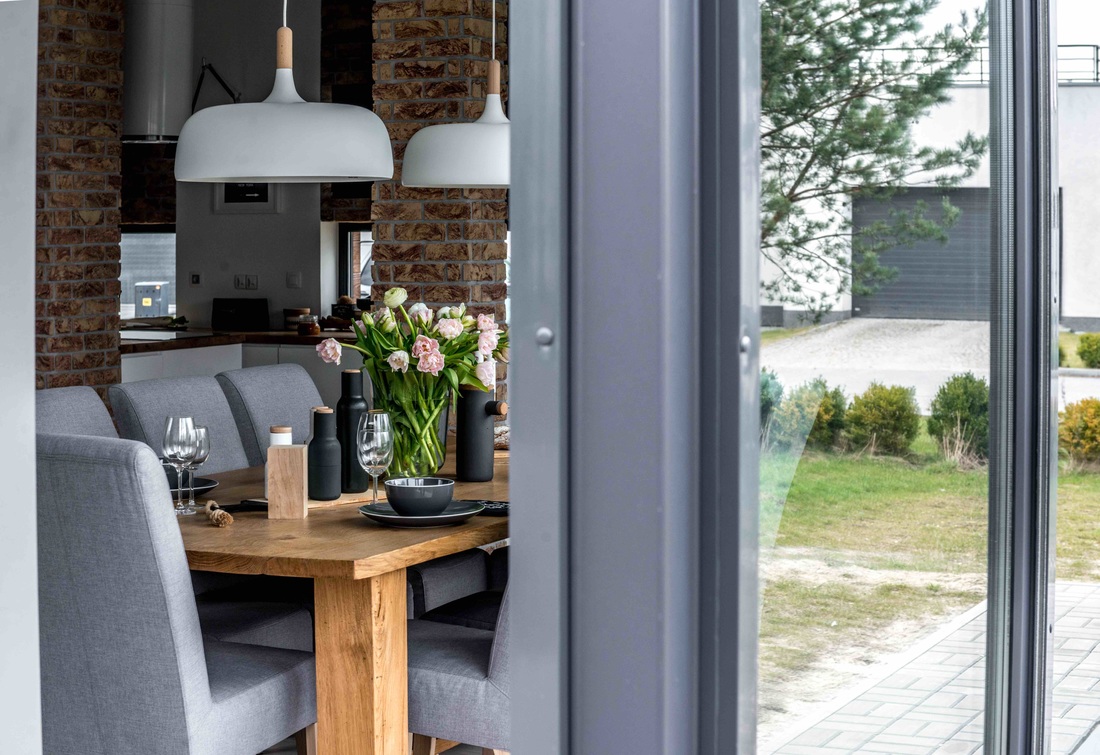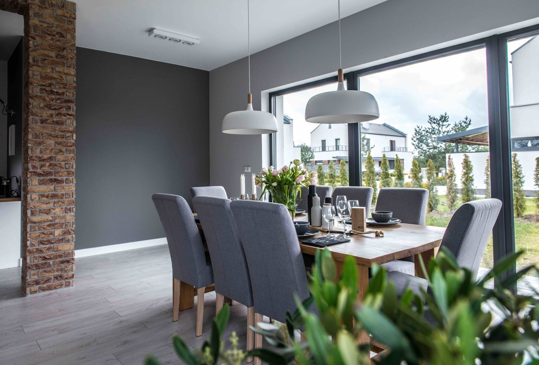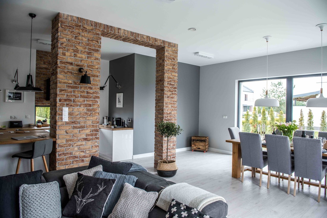 Designerii polonezi de la Shoko Design au avut o abordare practica si moderna cu influente nordice în amenajarea acestei case. La parter, spatiul deschis, amenajat în alb si mult gri este scos din anonimat prin caramida aparenta ce separa vizual bucataria de restul camerei. La etaj amenajarea minimalista din baie si dormitor aduc calm si relaxare intregului interior.