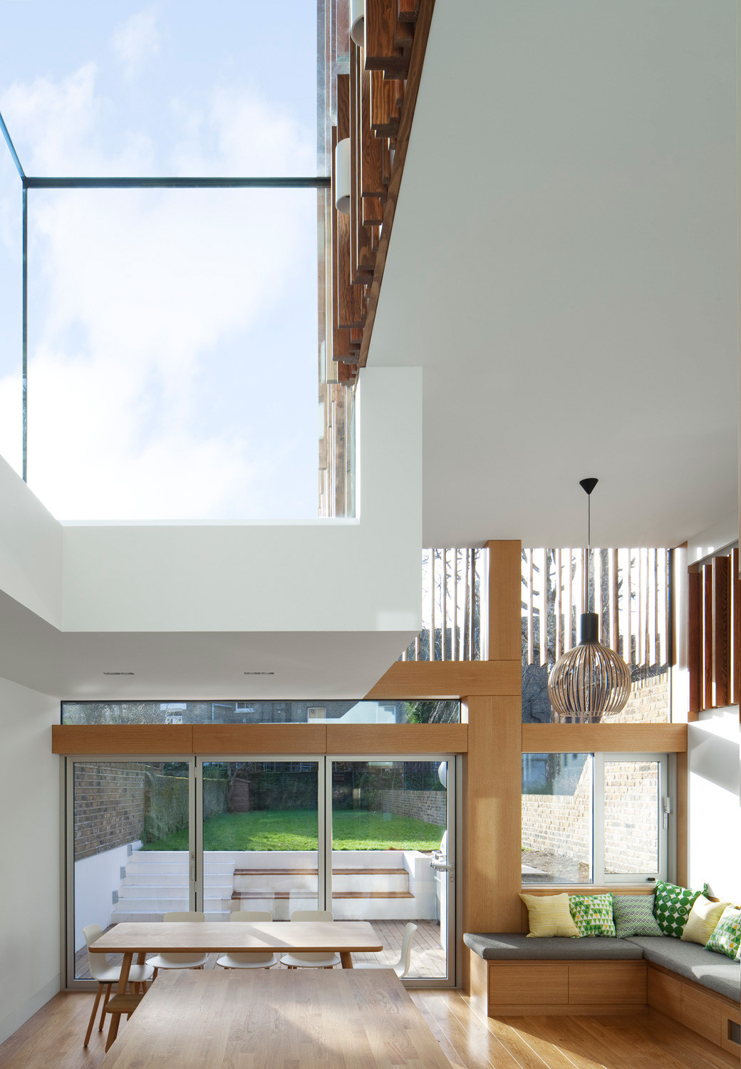 Proiectul renovării acestei case tipice victoriene, din cartierul londonez Highbury Hills, este realizat de arhitecții de la Paul Archer Design, iar punctul cheie al noii extinderi inguste este reprezentat de spațioasa bucătărie cu înățime dublă, rezultată din jocul de volume din sticlă fără rame și panouri liniare din lemn stratificat. Cutia strcturală de sticlă permite luminii directe a soarelui să pătrundă adânc în planul casei.