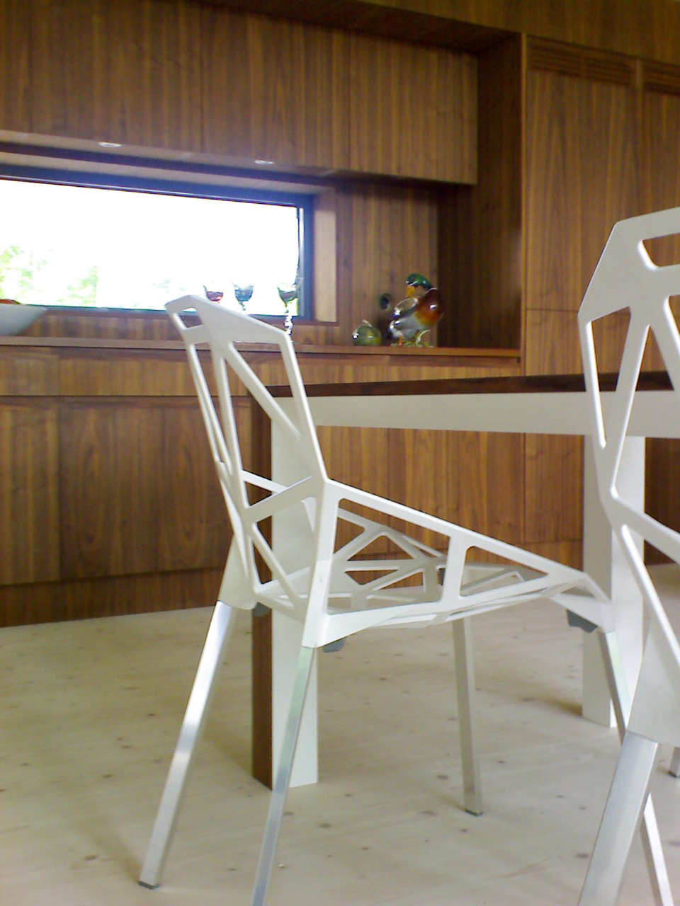 Exteriorul casei este destul de atragator, afisand o geometrie simpla, dar fermecatoare. Interioarele sunt spatioase si aerisite, ce ofera detalii decorative interesante, contraste de culoare si lemn creand o casa vie. Mai jos, catre lac, exista o casa de oaspeti si sauna, de aceeasi forma , dar cu dimensiuni diferite, a cladirii principale.