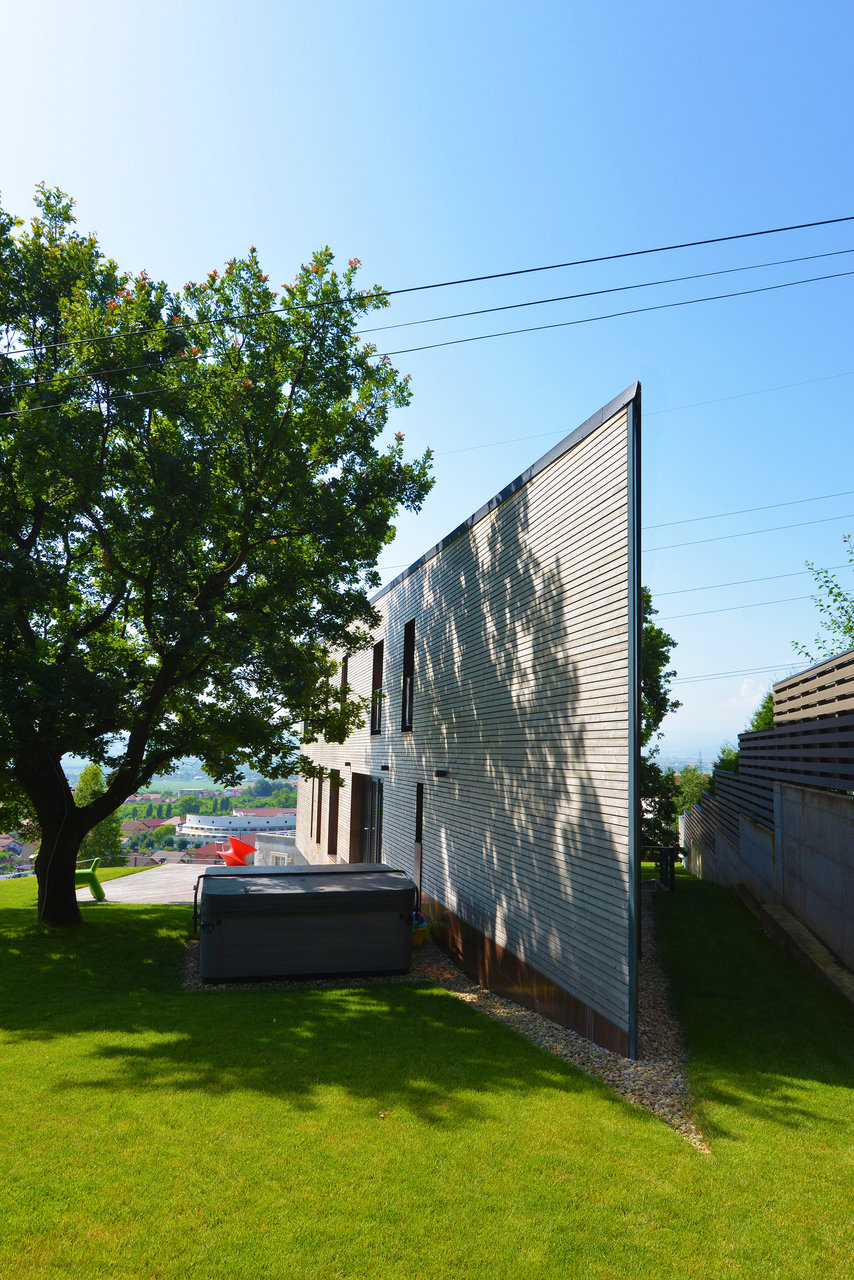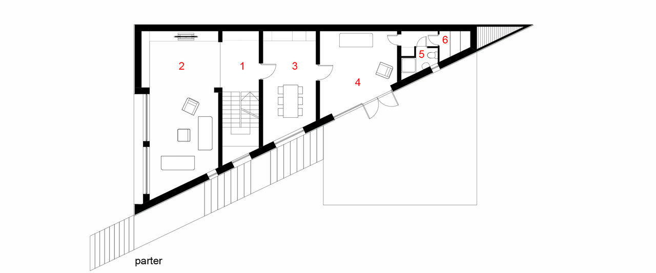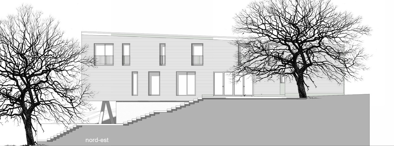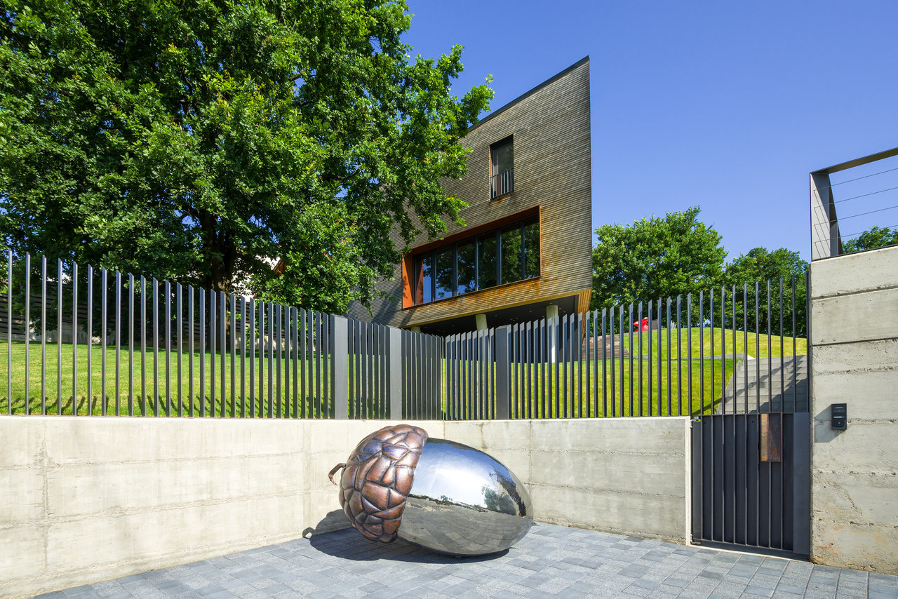 Demersul compozițional arhitectural a fost unul aproape chirurgical, în care arhitectul a intersectat planul casei, sub forma unui triunghi dreptunghic, cu planul înclinat al terenului, formă care a permis să foloseasca la maxim locul liber lăsat de stejari.