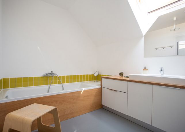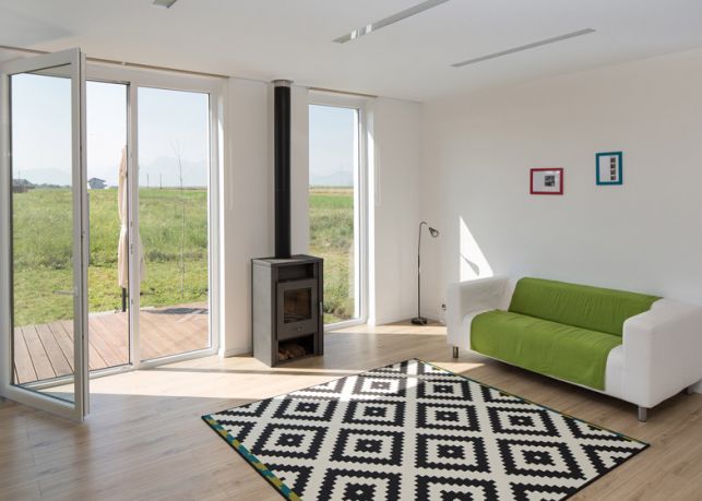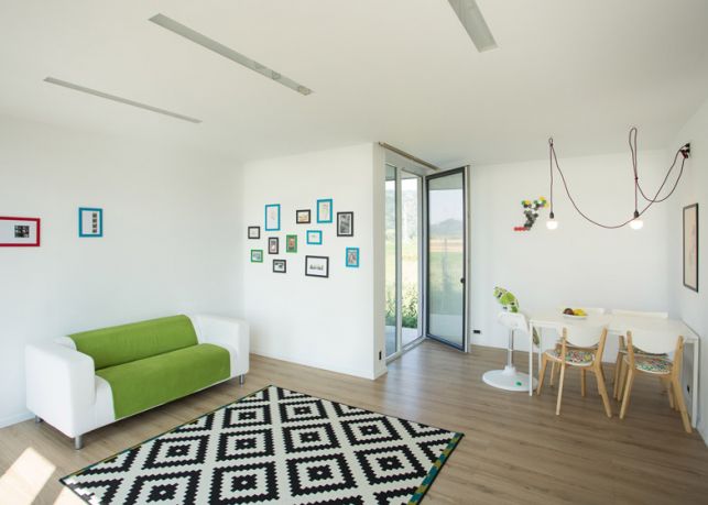 In interior, parterul compact include livingul, bucataria, o camera tehnica si o baie. Decorul ne duce cu gandul la multifunctionalitatea stilului scandinav. Peretii albi, podea din lemn si accente de culoare transpuse in decoratiuni. Casa foloseste o centrala termica pe gaz (una simpla cu capacitate „de apartament”), iar incalzirea se face prin pardoseala, pentru ca este un sistem ce poate fi în viitor bransat la o alta sursa decat centrala termica pe gaz, cum ar fi un sistem de energie alternativa. La etaj intalnim mai multa culoare – verde, turcoaz si galben pentru a compensa calmul holului gri si al parterului.