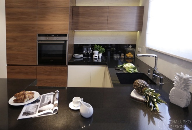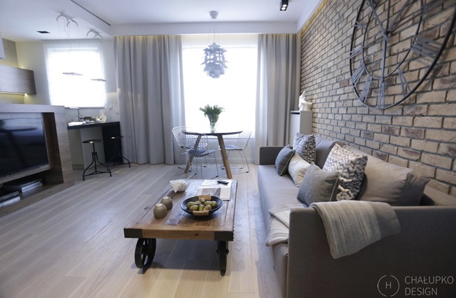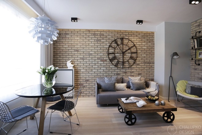 Caramida aparenta, masuta de cafea in stil industrial cu elemente de feronerie, elementele metalice negre utilizate pentru realizarea rafturilor din living, tratarea spatarului scaunelor cu plasa metalica neagra –toate aceste detalii duce cu gandul catre industrial si in acelasi timp apartamentul are o atmosfera moderna. Livingul reprezinta centrul apartamentului si da tonul estetic cu ajutorul elementelor alese cu gust. Toate spatiile au fost mobilate si decorate subtil, neutru si ofera senzatia de caldura familiala. Paleta nuantelor de bej se contrasteaza perfect cu lemnul de nuc, blatul negru din granit de la bucatarie, elementele metalice negre din living, cu griul intunecat a faiantei din baie si tapetul intunecat din dormitor. In concluzie – un interior usor, fin si rafinat.