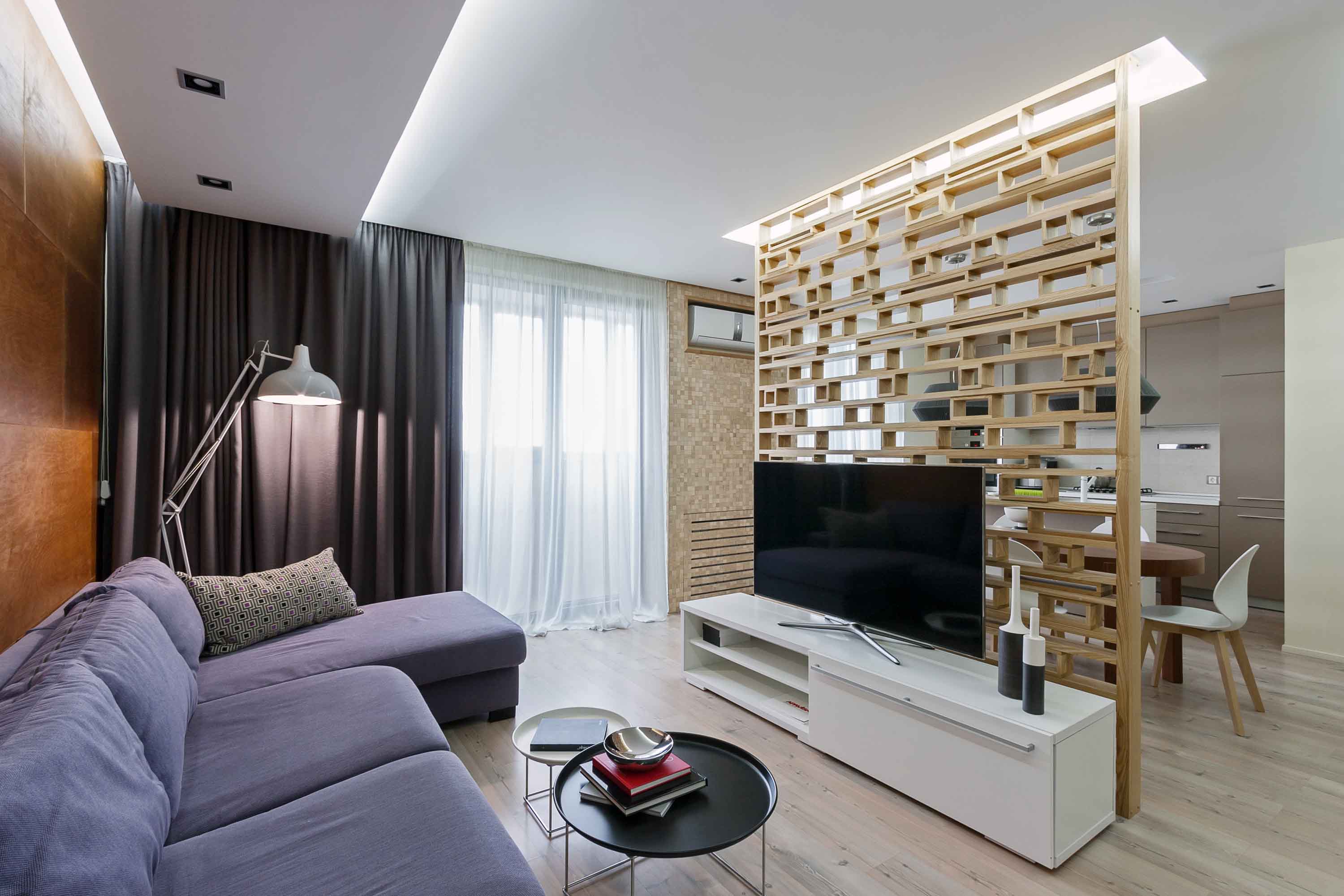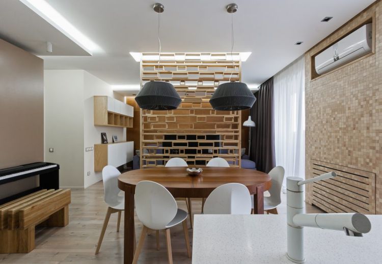 Acest impresionant si comod apartament, amenajat de designerul Eugene Meshcheruk se afla in Zaporojie, Ucraina. In apartamentul de 83mp au fost demolati toti peretii nestructurali pentru a obtine un spatiu larg si plin de lumina naturala. Elementul central care a generat solutia de distribuire a spatiilor a fost un perete realizat din elemente de lemn care are si rolul de separeu intre living, bucatarie si locul de luat masa.