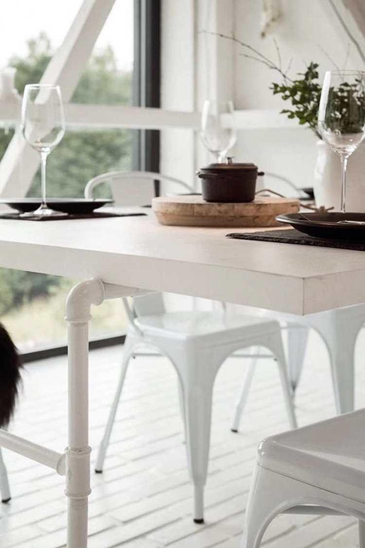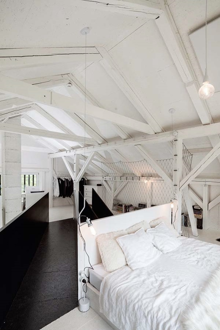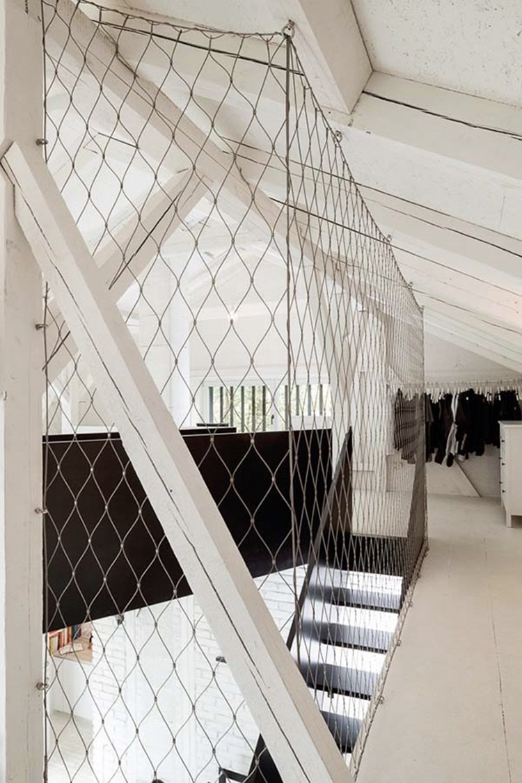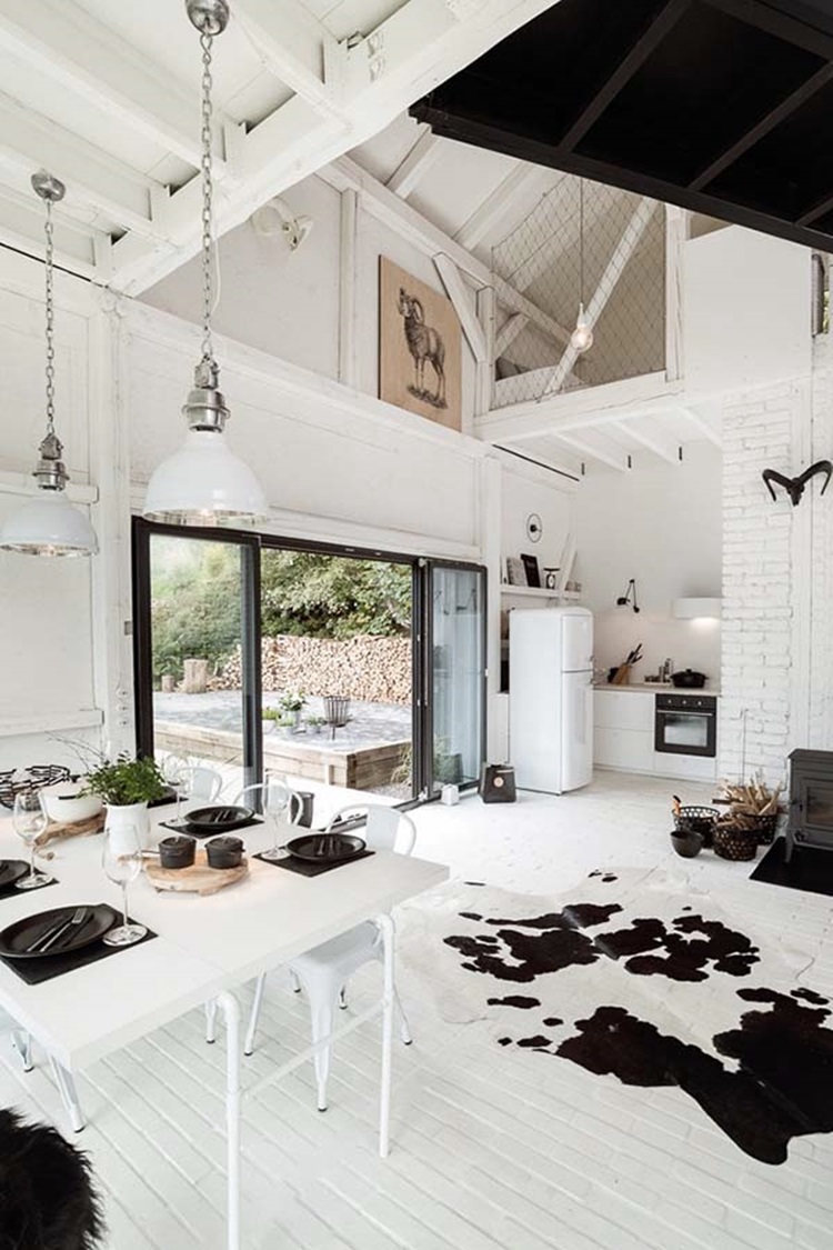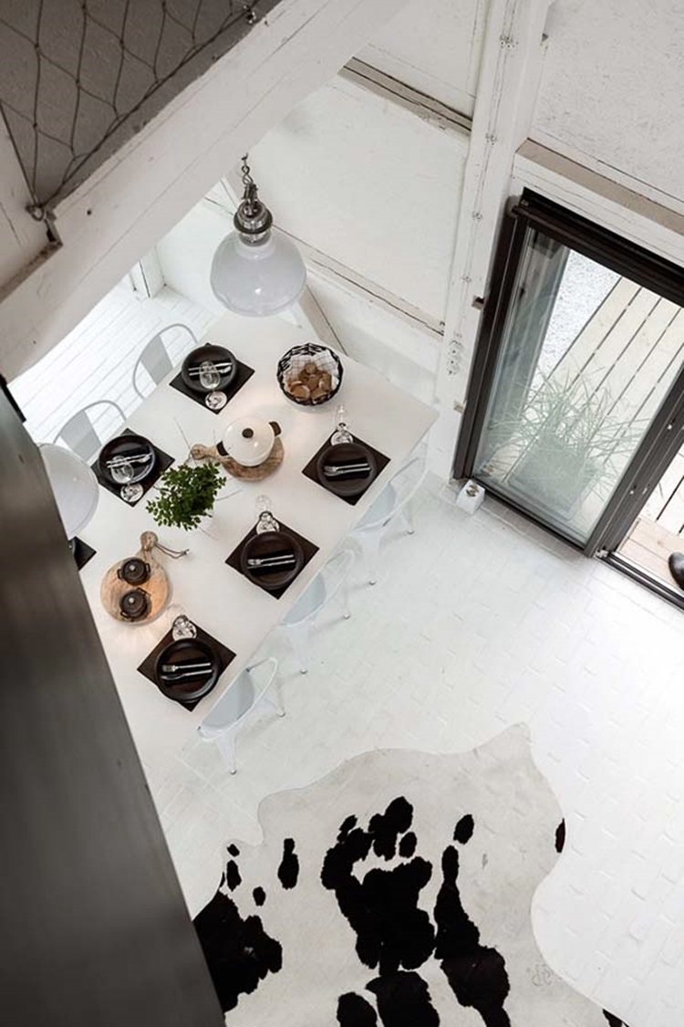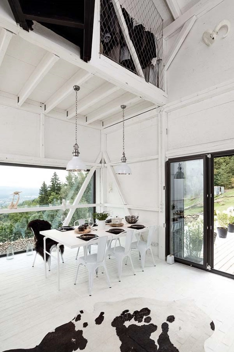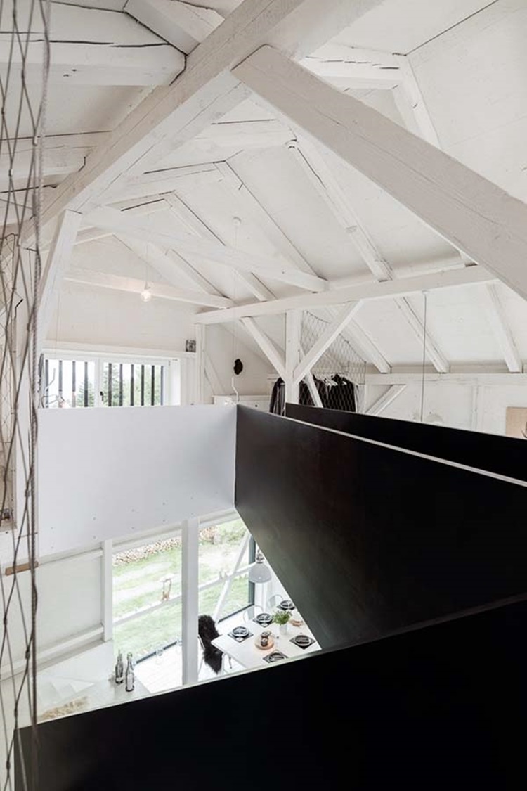 Ca si compartimentare au fost aduse doar niste parapeti si pereti realizati din plasa care au rolul de a proteja copiii si animale casei sa nu cada. Scara a fost compusa prin realizarea de platforme cu scopul de a utiliza spatiul de sub ele pentru depozitari. Interiorul fiind in intregime realizat in alb, s-au adaugat elemente de detaliu cu nuanta neagra (balustrada scarii, tamplaria), dar si alte mici detalii cu nuante de gri. Ca element de legatura si aluzie la relatia interior-exterior sau alb-negru, a fost propus un covoras realizat pe motivul texturii pielii de vaca. In acest fel se face si o legatura intre modern si traditional.