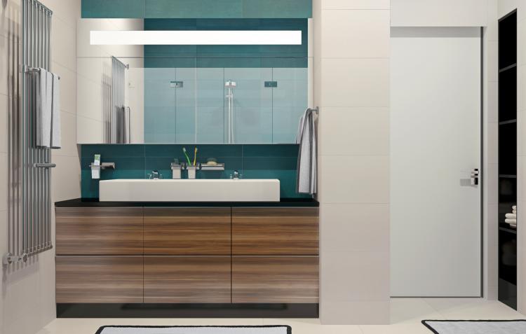 Panourile de nuanta turcoaz, suprafetele care reflecta, imaginea lemnului pe suprafetele verticale, cat si detaliile de mobilier simpliste tratate intr-o gama cromatica a gri-ului te face sa stai si sa savurezi spatiul asa cum este. Zona de noapte a fost amenajata in acelasi stil: suprafete albe, gri intunecat, imaginea lemnului de maslin pe pereti, in combinatie cu elemente presarate de turcoaz. Este o amenajare unica, si exprima perfect personalitatea proprietarilor care a fost sculptata cu ajutorul designerilor.