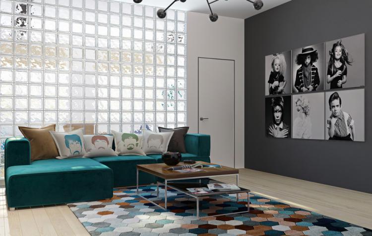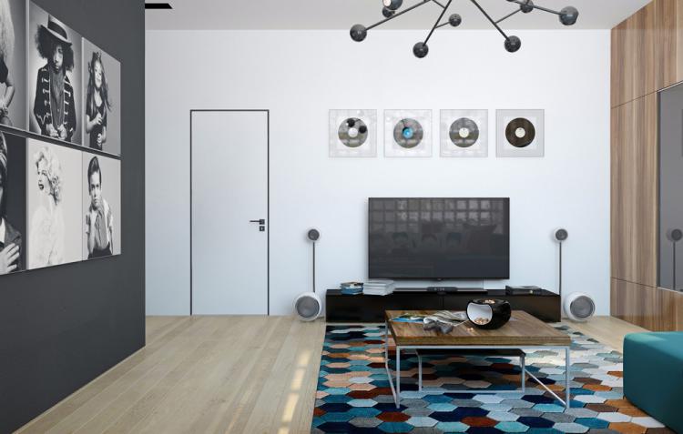 Zona de zi atrage atentia printr-un element neordinar care impodobeste peretele – o vitrina cu 5 chitare de diferite stiluri. Zona de zi nu a fost tratata in mod obisnuit prin pozitionarea cat mai aproape de vreun gol de fereastra. Din contra – a fost amplasat catre zona mai retrasa de fatada. Elementul de esenta in iluminarea livingului a devenit un perete realizat din caramida de sticla care ajuta spatiul sa primeasca o lumina filtrata. Tratarea neformala a detaliilor de interior provoaca o atragere in zona bucatarie si locului de luat masa.