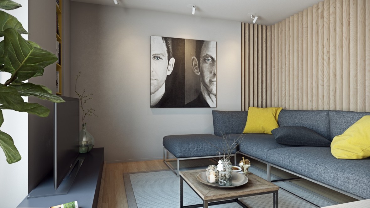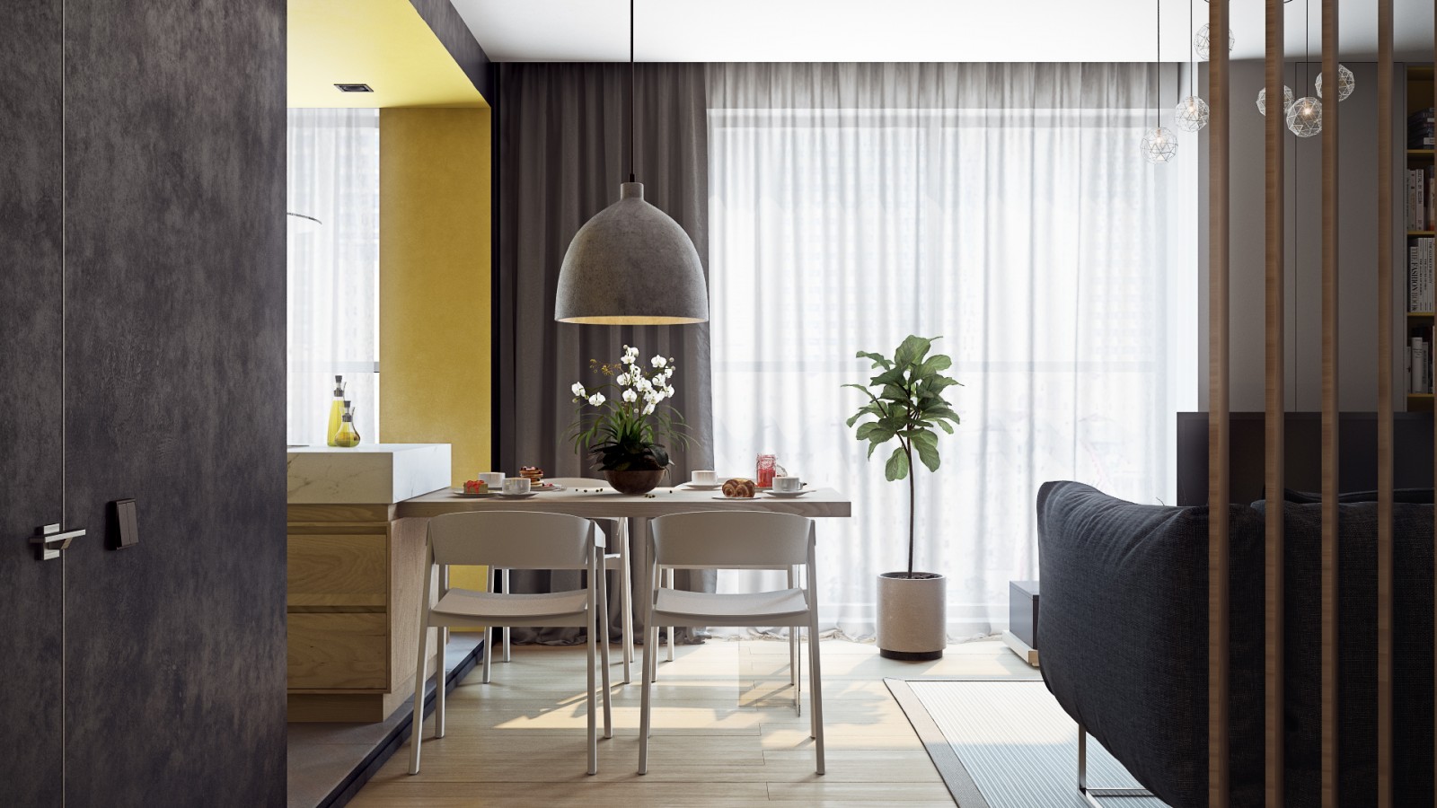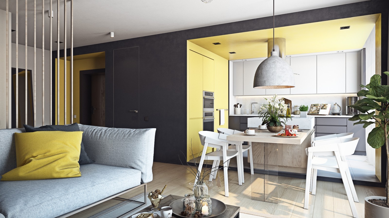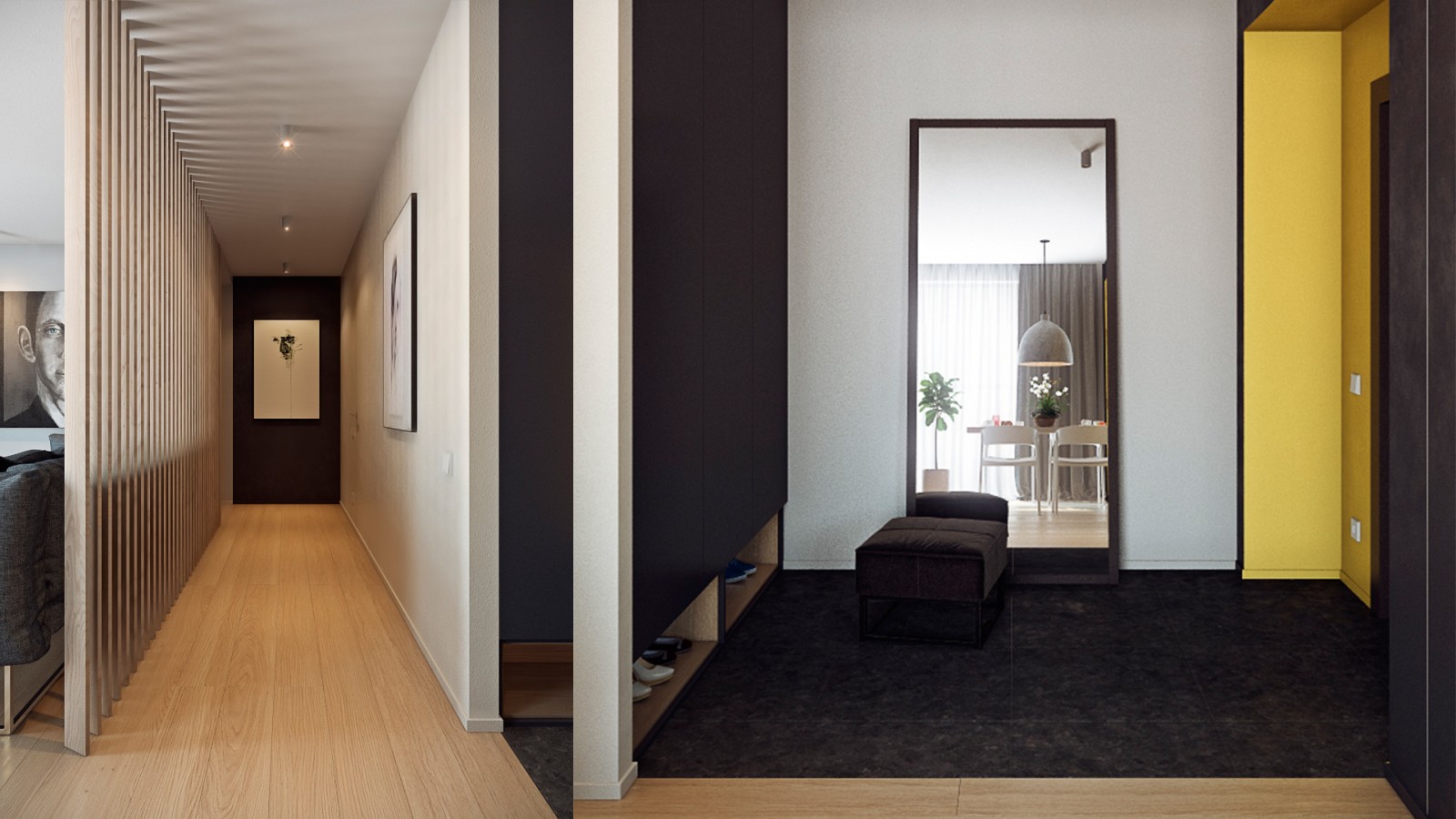 Designul acestui apartament cu trei camere este realizat de Form’8 Studio , intr-un stil modern cu utilizarea contrastului coloristic. Zonele de intrare si bucataria sunt inglobate intr-o nisa in care culoarea galbena domina vizual. Zona de living este mai silentioasa cromatic, cu nuante de gri deschis si bej. Compartimentul dintre camera de zi si coridor este realizat din sipci verticale din lemn, conferind interiorului o atmosfera mai confortabila si intima.