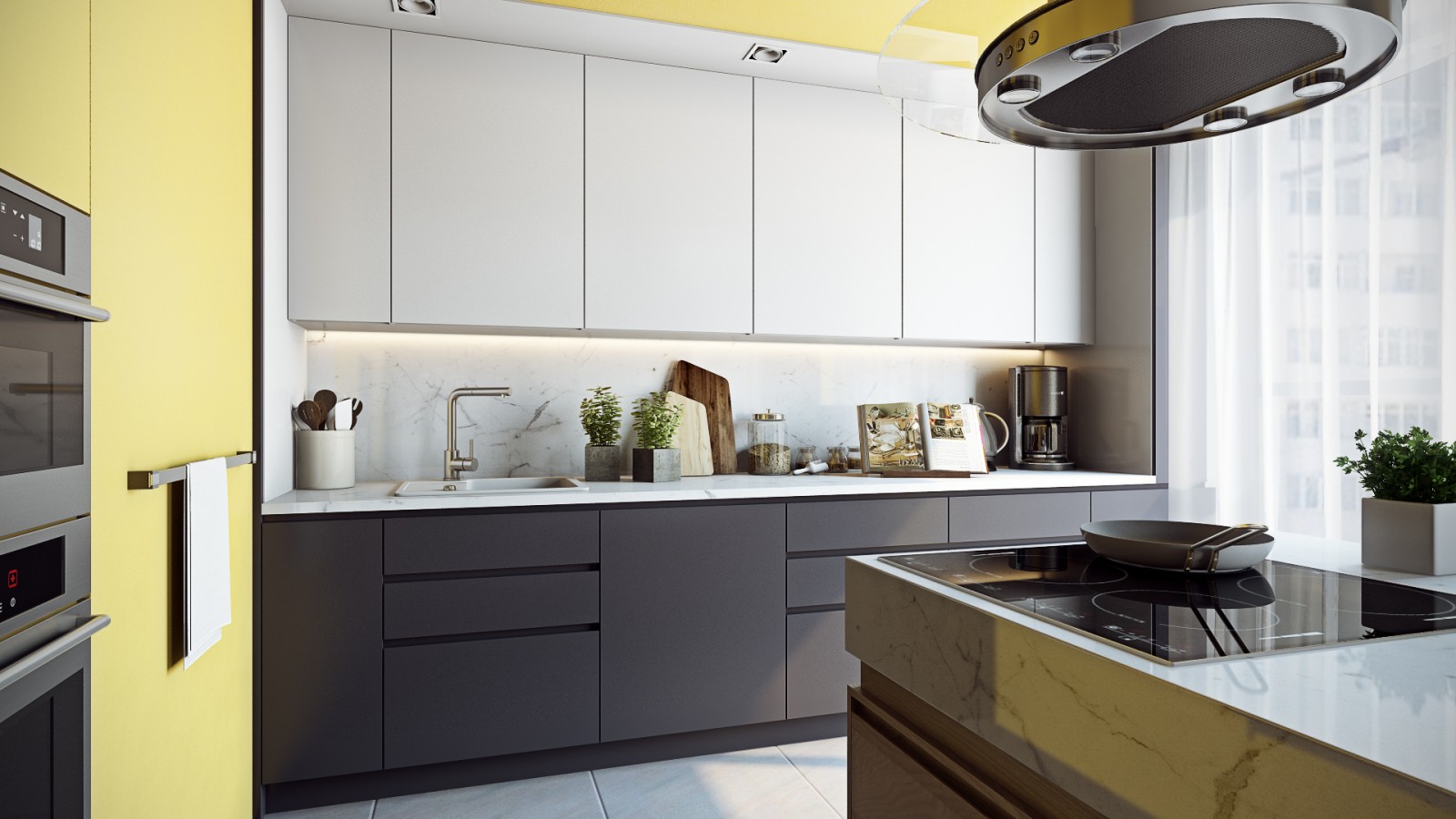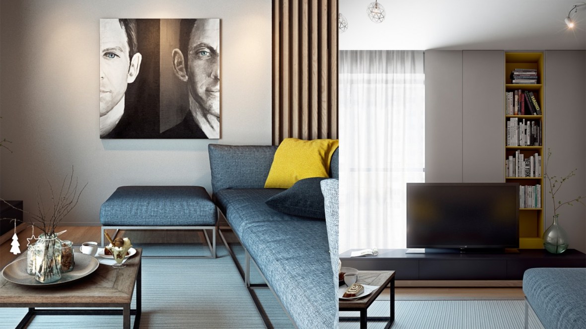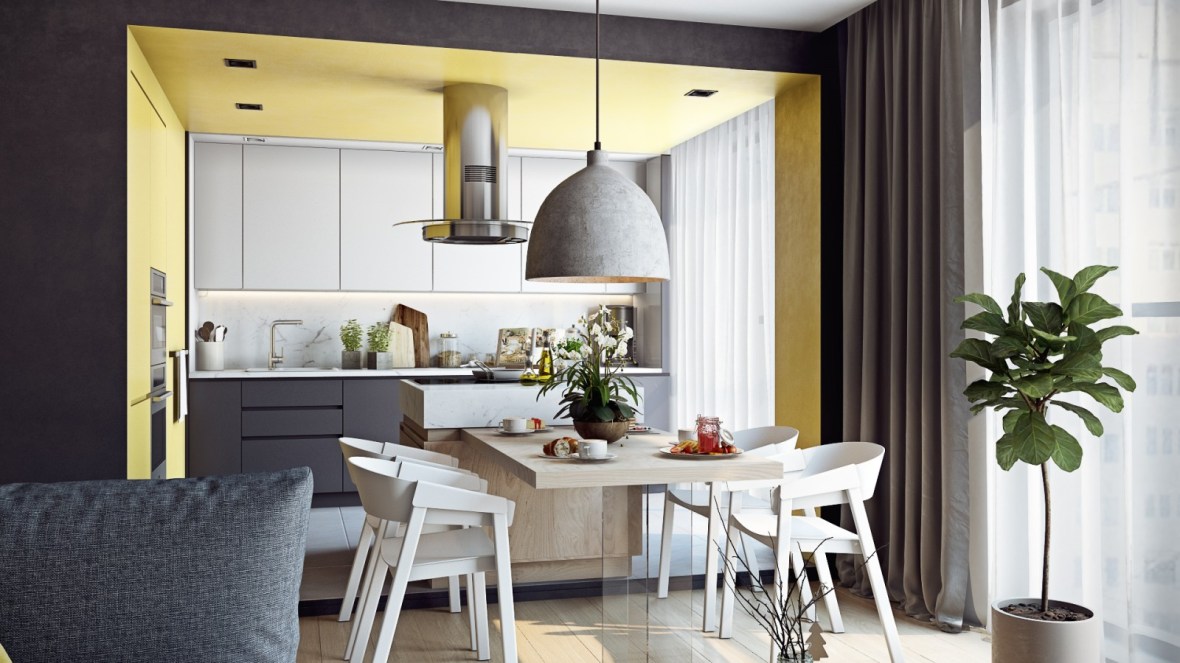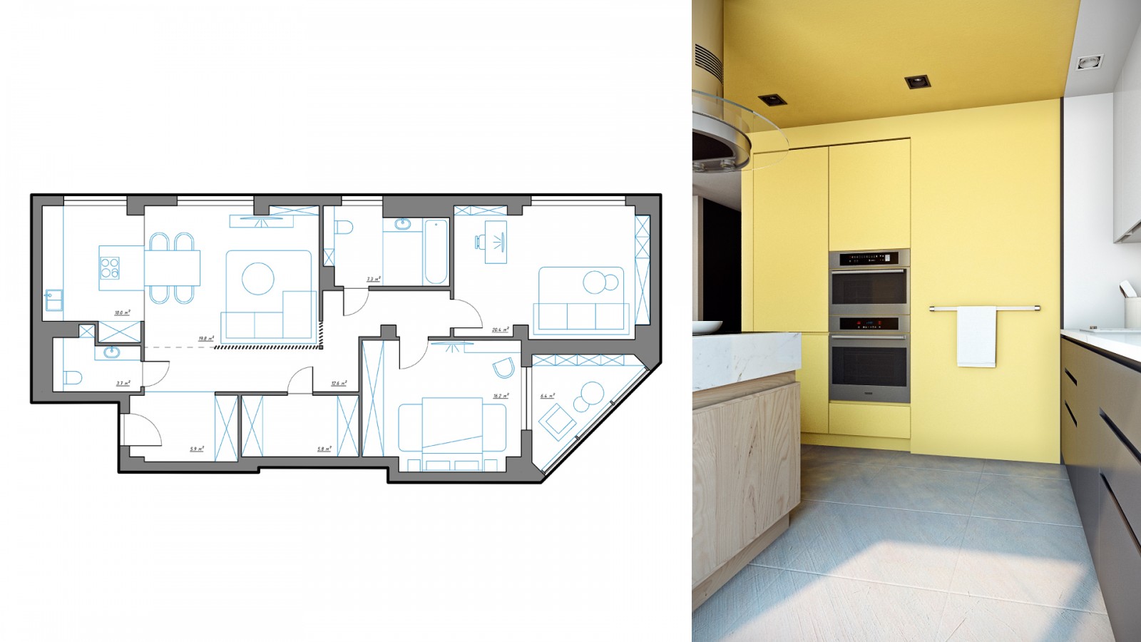 Designul acestui apartament cu trei camere este realizat de Form’8 Studio , intr-un stil modern cu utilizarea contrastului coloristic. Zonele de intrare si bucataria sunt inglobate intr-o nisa in care culoarea galbena domina vizual. Zona de living este mai silentioasa cromatic, cu nuante de gri deschis si bej. Compartimentul dintre camera de zi si coridor este realizat din sipci verticale din lemn, conferind interiorului o atmosfera mai confortabila si intima.