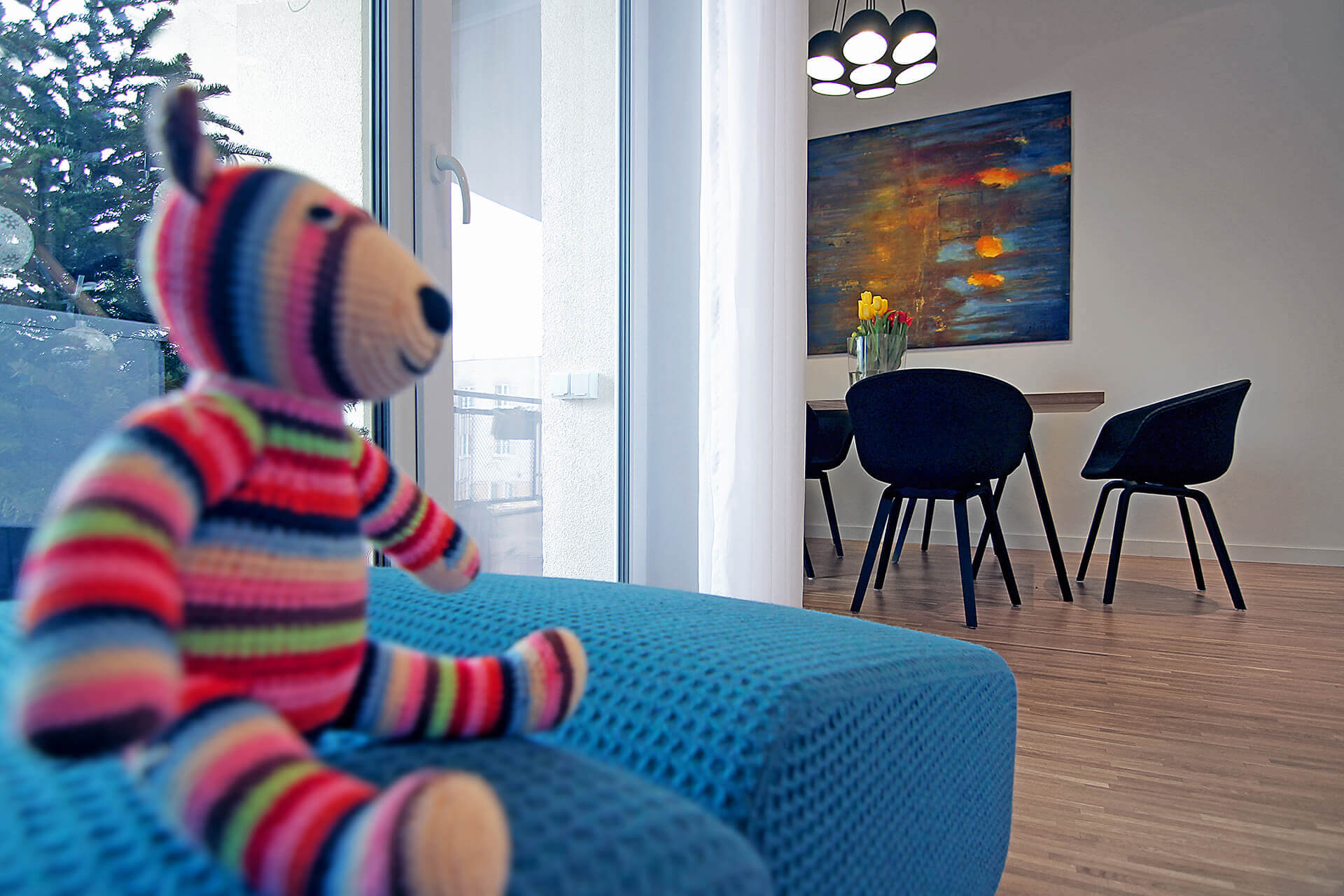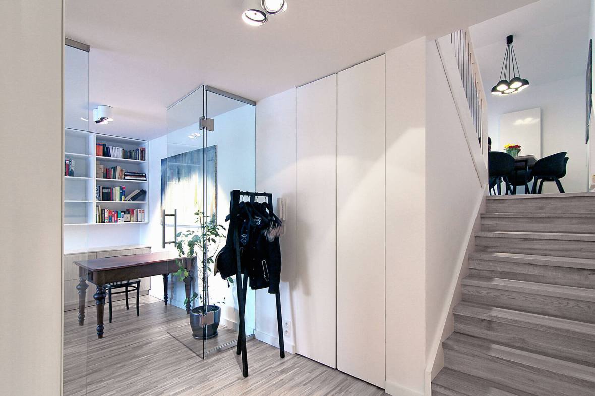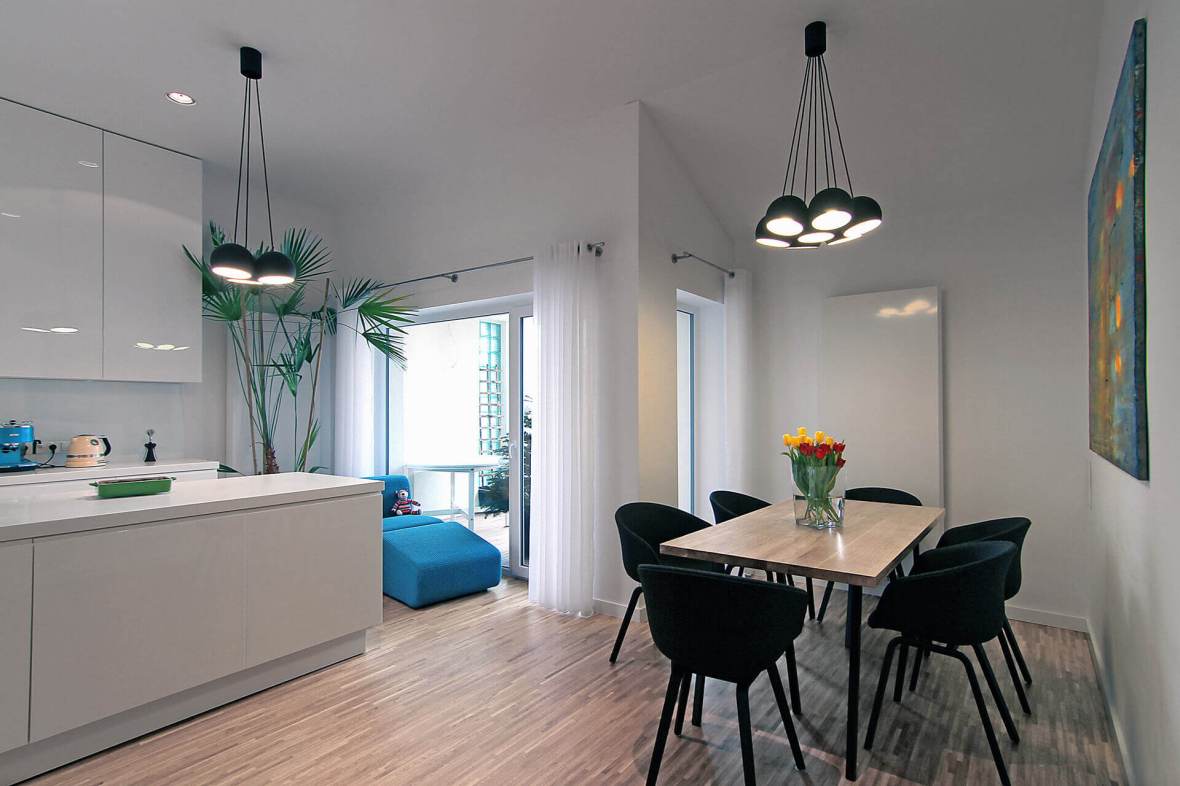 Acest apartament cu trei niveluri dintr-o casa moderna din Poznań, Polonia a fost proiectat de NeoStudio intr-un stil modern, minimalist. Toate etajele sunt finisate cu mobilier din lemn de culoare deschisa, iar peretii si plafoanele sunt vopsite in alb. Bucataria este pastrata si ea in aceasta nuanta, cu mobilier simplu alb lucios. Elementul care rupe acesta mononie este o canapea albastra, dar si cateva scaune negre din zona bucatariei. Atat dormitorul cat si baia aflata la un nivel superior sunt complet finisate in alb. Apartamentul este luminos si confortabil, oferind posibilitati nesfarsite de amenajare cu diverse accesorii.