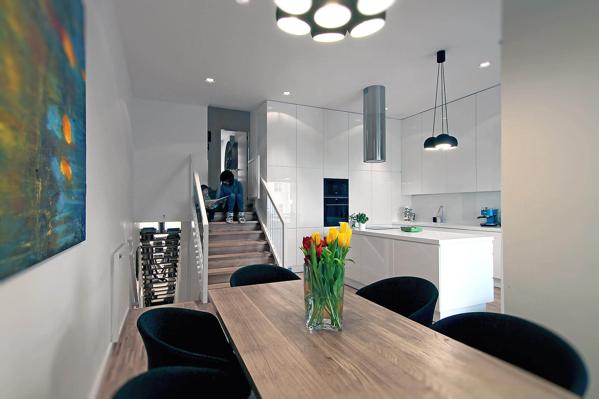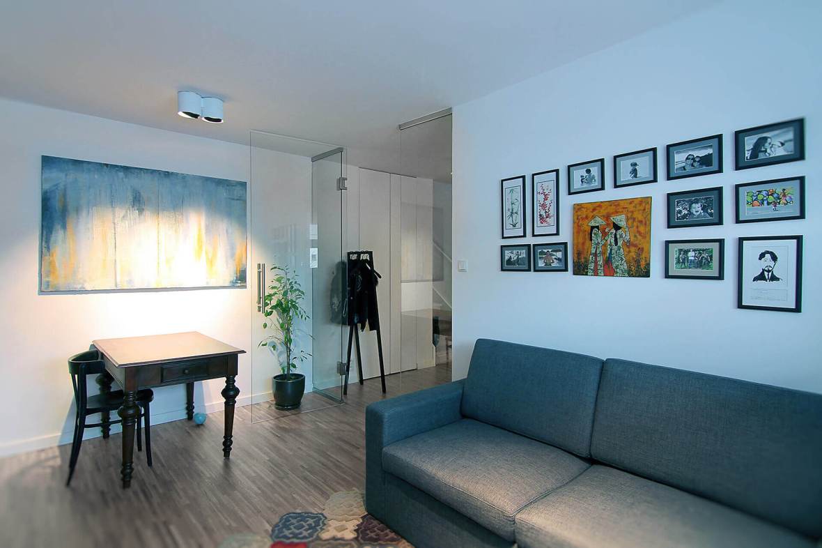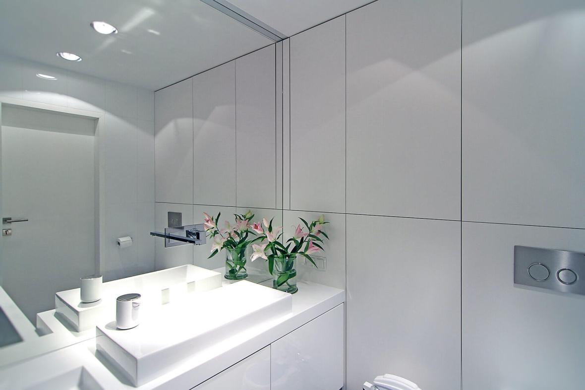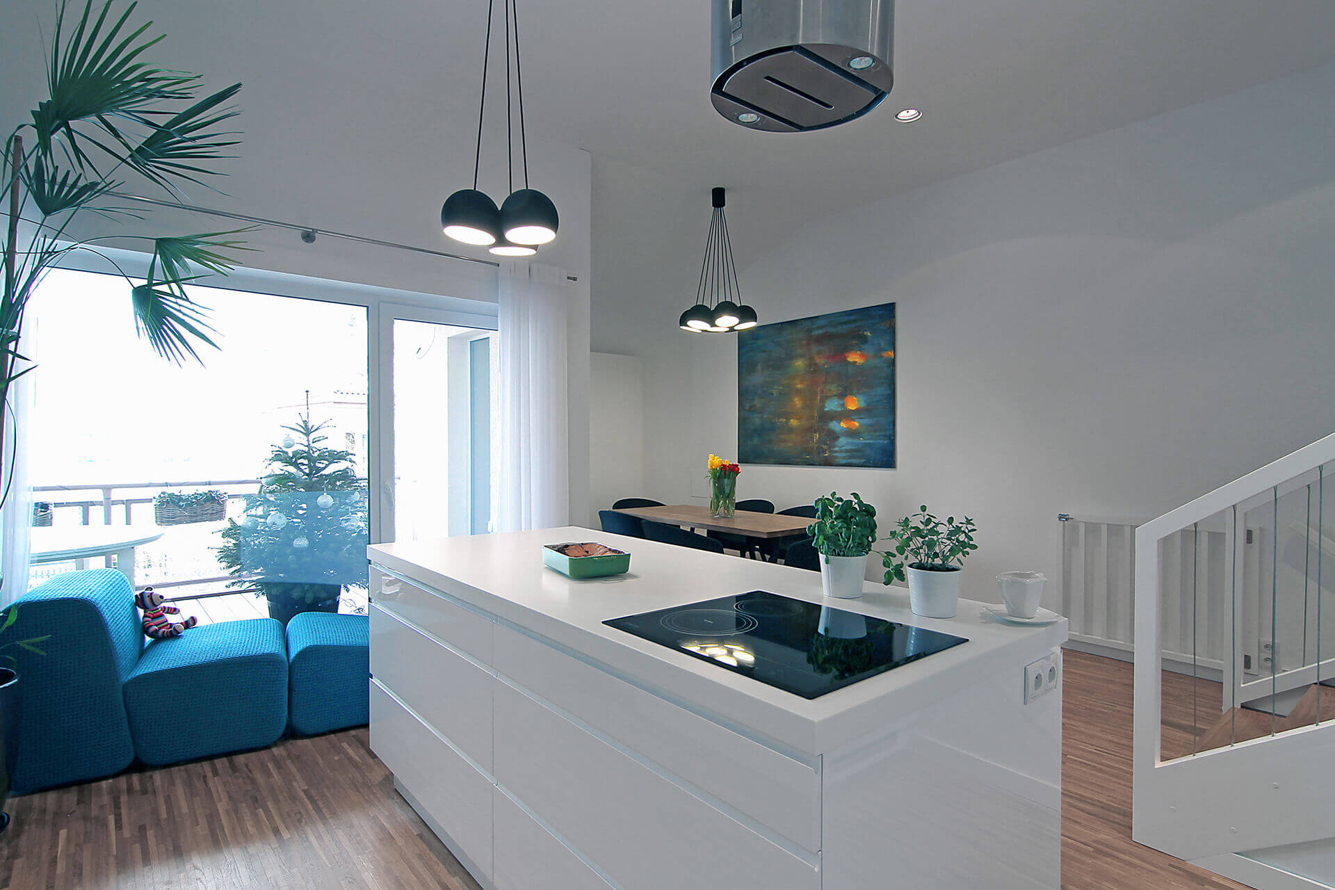 Acest apartament cu trei niveluri dintr-o casa moderna din Poznań, Polonia a fost proiectat de NeoStudio intr-un stil modern, minimalist. Toate etajele sunt finisate cu mobilier din lemn de culoare deschisa, iar peretii si plafoanele sunt vopsite in alb. Bucataria este pastrata si ea in aceasta nuanta, cu mobilier simplu alb lucios. Elementul care rupe acesta mononie este o canapea albastra, dar si cateva scaune negre din zona bucatariei. Atat dormitorul cat si baia aflata la un nivel superior sunt complet finisate in alb. Apartamentul este luminos si confortabil, oferind posibilitati nesfarsite de amenajare cu diverse accesorii.
