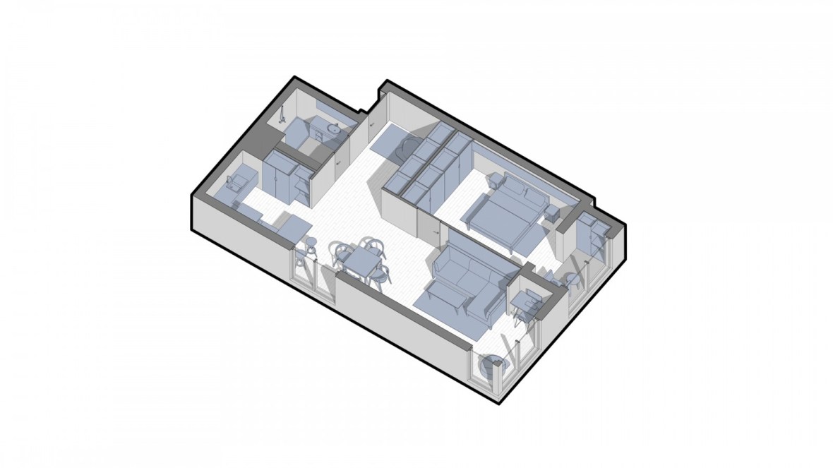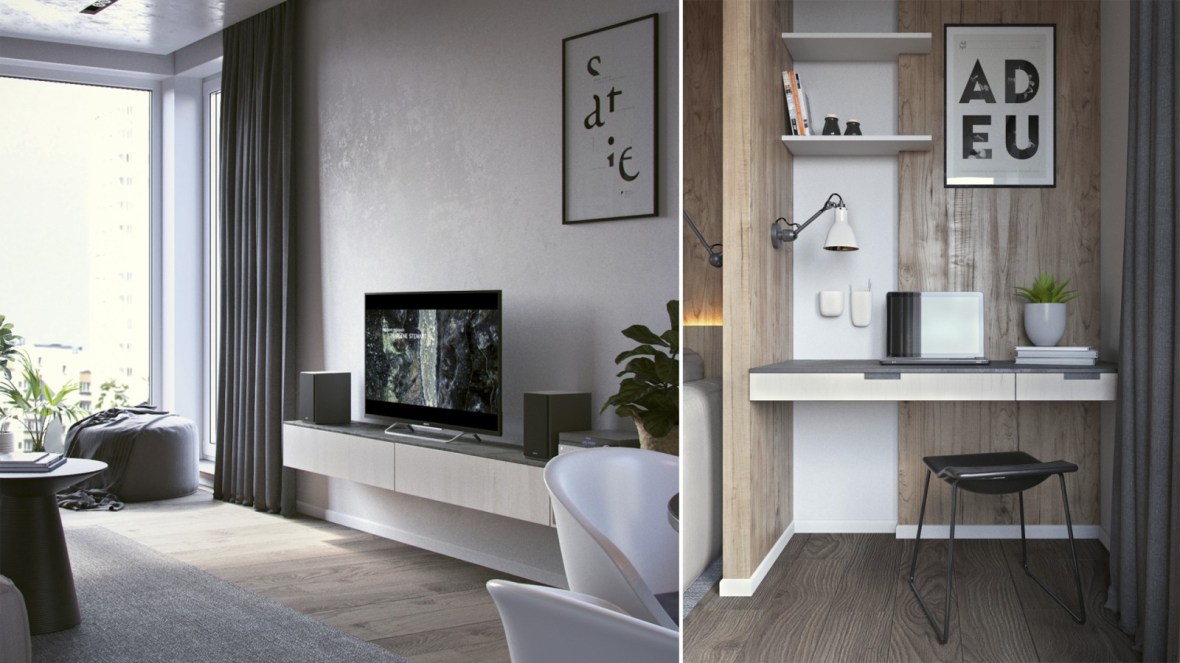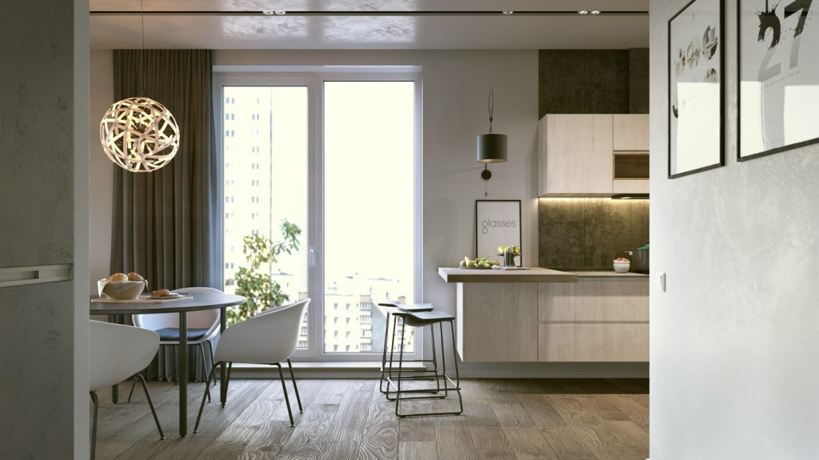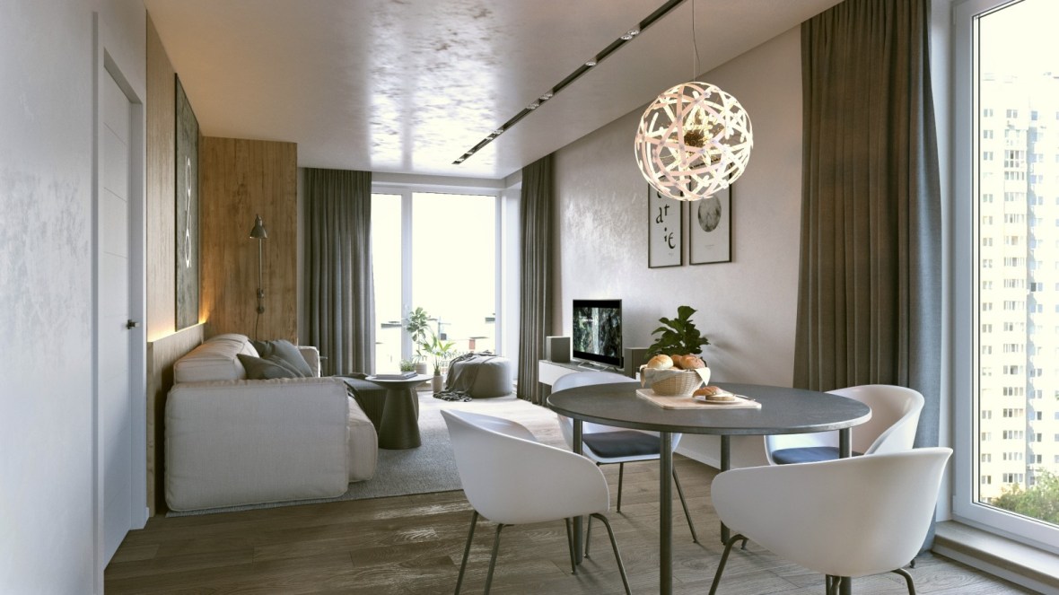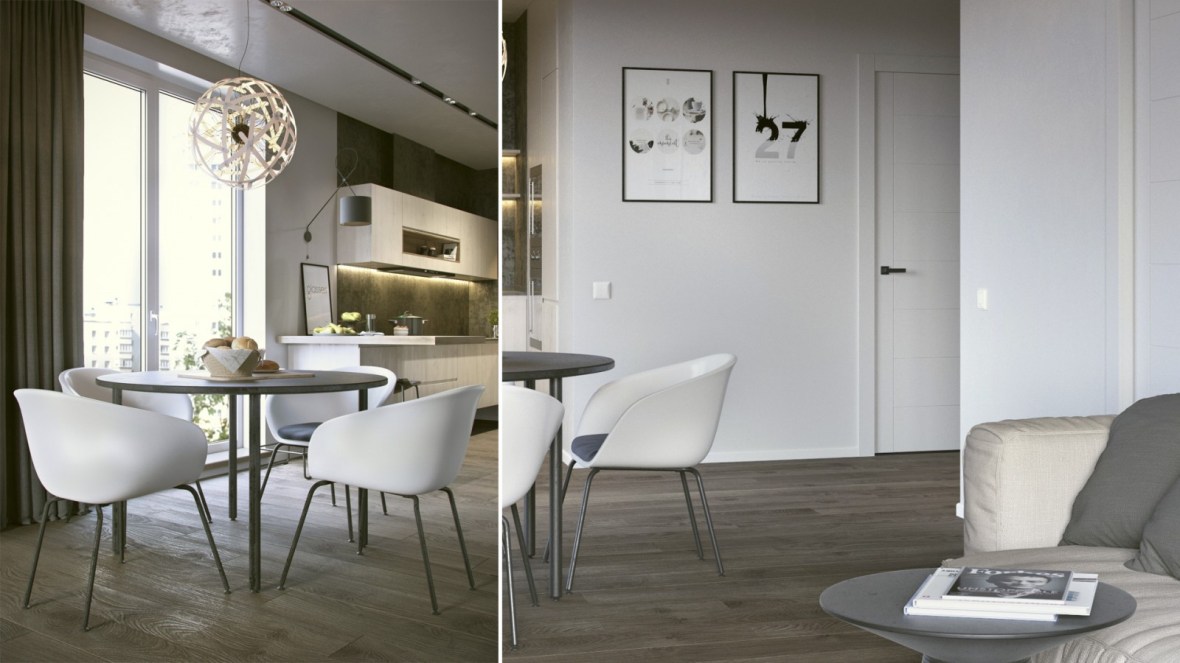 Interiorul apartamentului Mr. Grey cu doua camere este proiectat de Form’8 Studio , pentru un tanar intreprinzator si are un aspect ce defineste un tip burlac. Spatiul liber al bucatariei si al camerei de zi este sustinut de o nuanta gri intr-un stil modern. Spatiul de retragere, dormitorul, poarta doar functia de somn si odihna. Cu toate acestea, logia din aceasta zona extinde spatiul si il umple de lumina naturala, dar adauga si posibilitatea de petrecere a timpului liber dimineata sau seara la o ceasca de cafea sau citind o carte.
