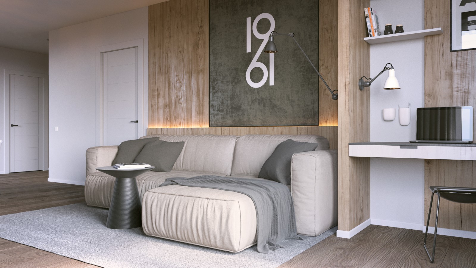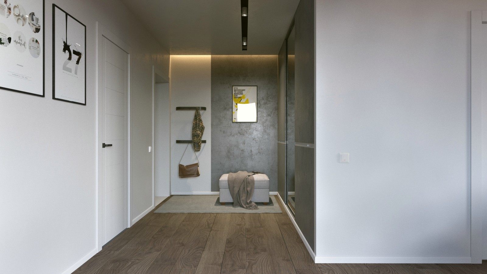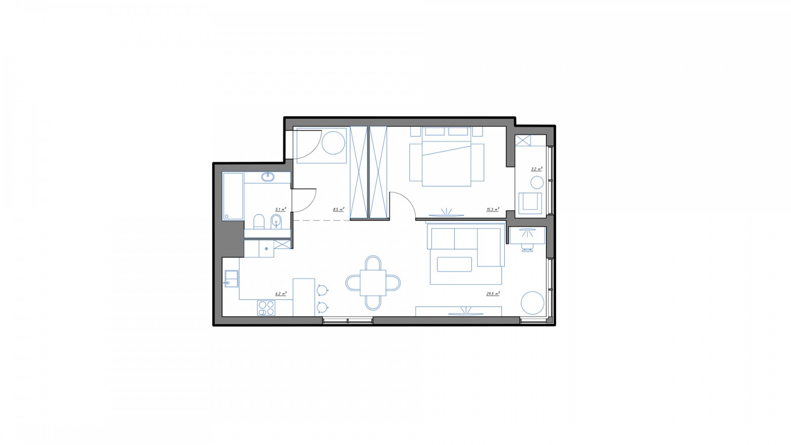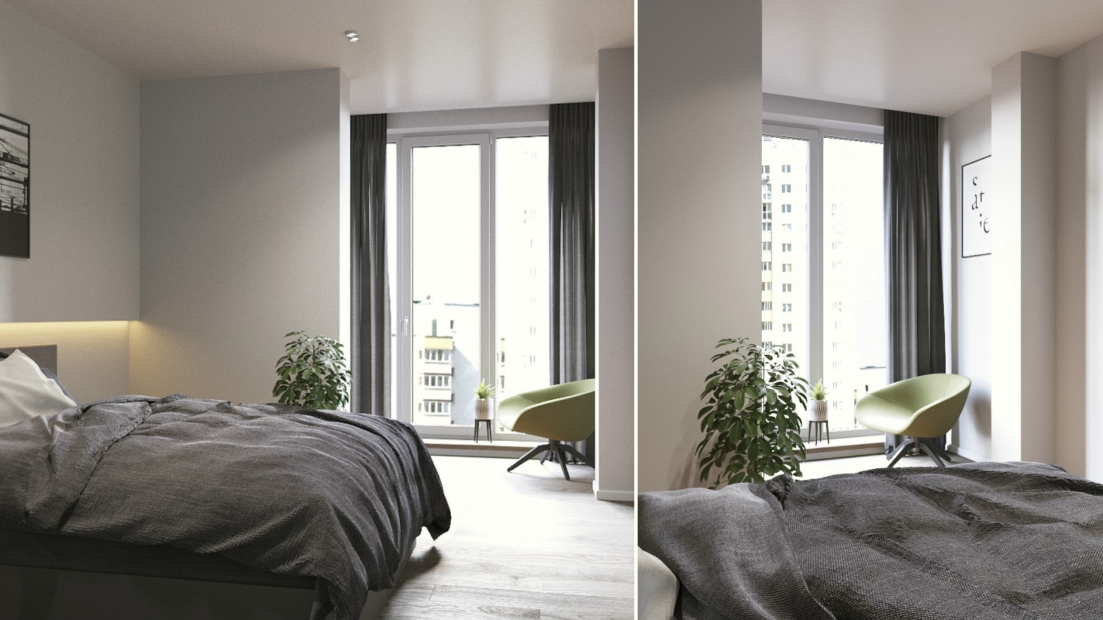 Interiorul apartamentului Mr. Grey cu doua camere este proiectat de Form’8 Studio , pentru un tanar intreprinzator si are un aspect ce defineste un tip burlac. Spatiul liber al bucatariei si al camerei de zi este sustinut de o nuanta gri intr-un stil modern. Spatiul de retragere, dormitorul, poarta doar functia de somn si odihna. Cu toate acestea, logia din aceasta zona extinde spatiul si il umple de lumina naturala, dar adauga si posibilitatea de petrecere a timpului liber dimineata sau seara la o ceasca de cafea sau citind o carte.