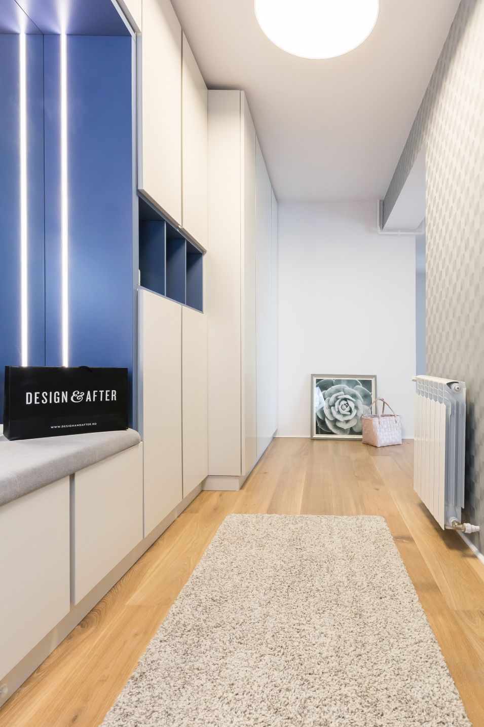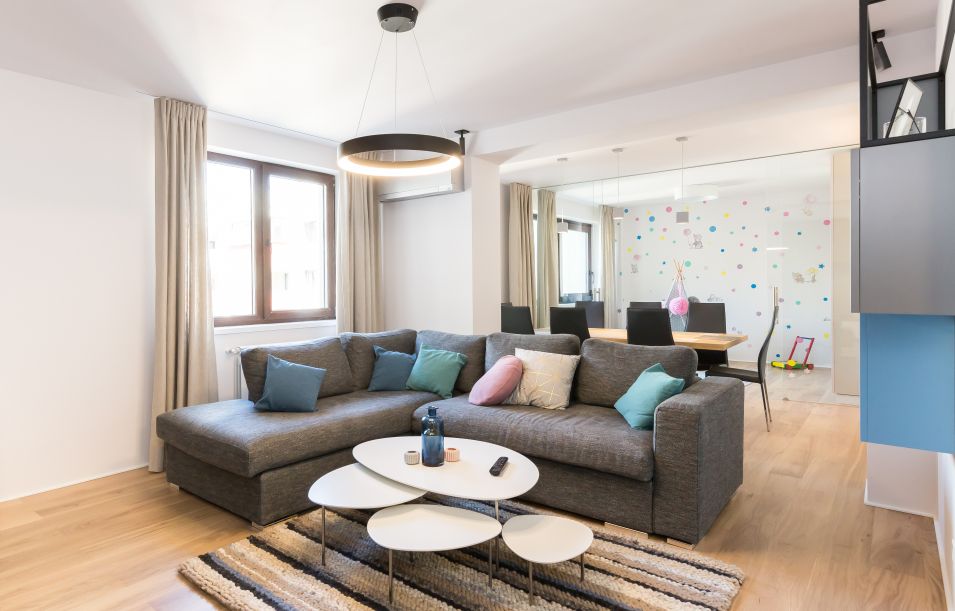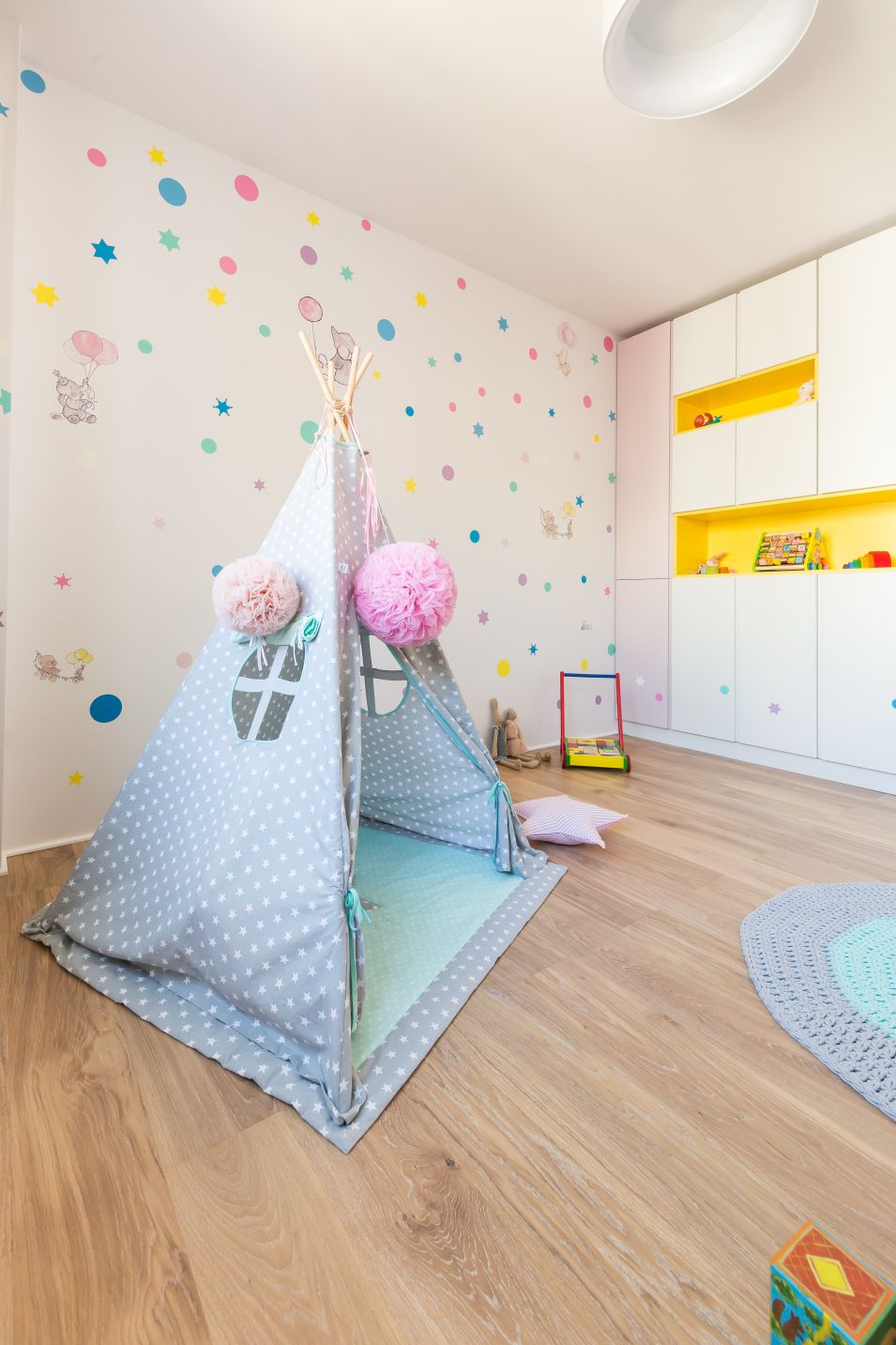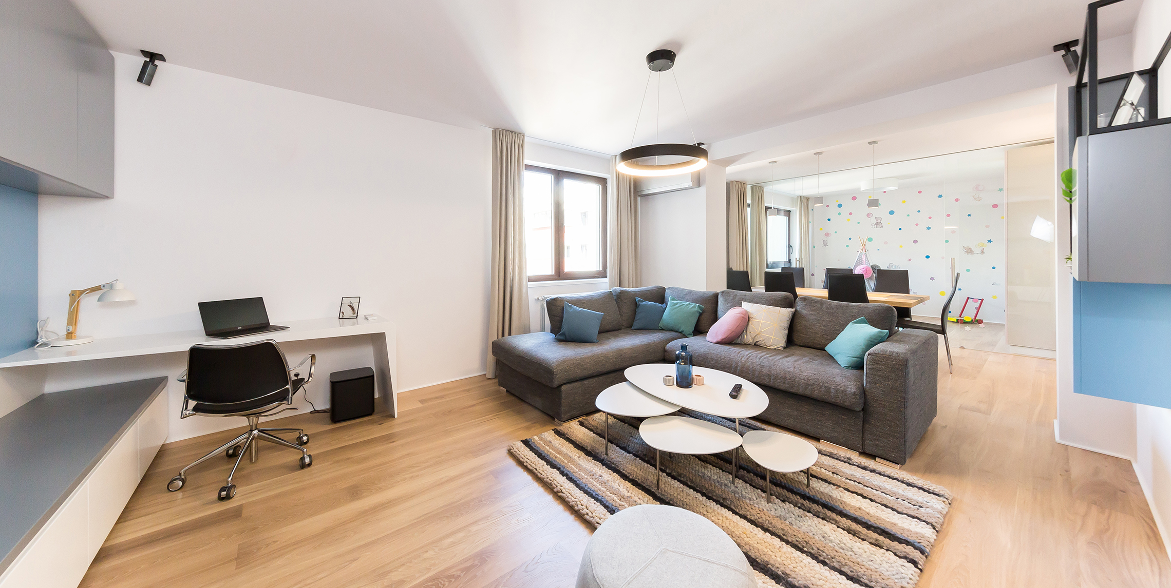Linii geometrice, volume clare, culori curajoase, aceasta ar fi descrierea pe scurt a apartament modern situat in zona de nord a Bucurestiului si amenajat de echipa JoocaStudio. Camera fetitei a fost amenajata dupa principiile Montessori: patul tip casuta plasat direct pe pardoseala, cortul si rafturile de jucarii joase dau libertate de miscare copilului, fara a avea nevoie de ajutorul parintilor. Camera de joaca a fetitei din zona camerei de zi, a fost separata de dining printr-un perete de sticla, astfel incat sa se pastreze unitatea vizuala a spatiului, dar sa fie si izolata fonic. Spatiul de zi este aerisit, amenajat in volume simple si culori naturale.