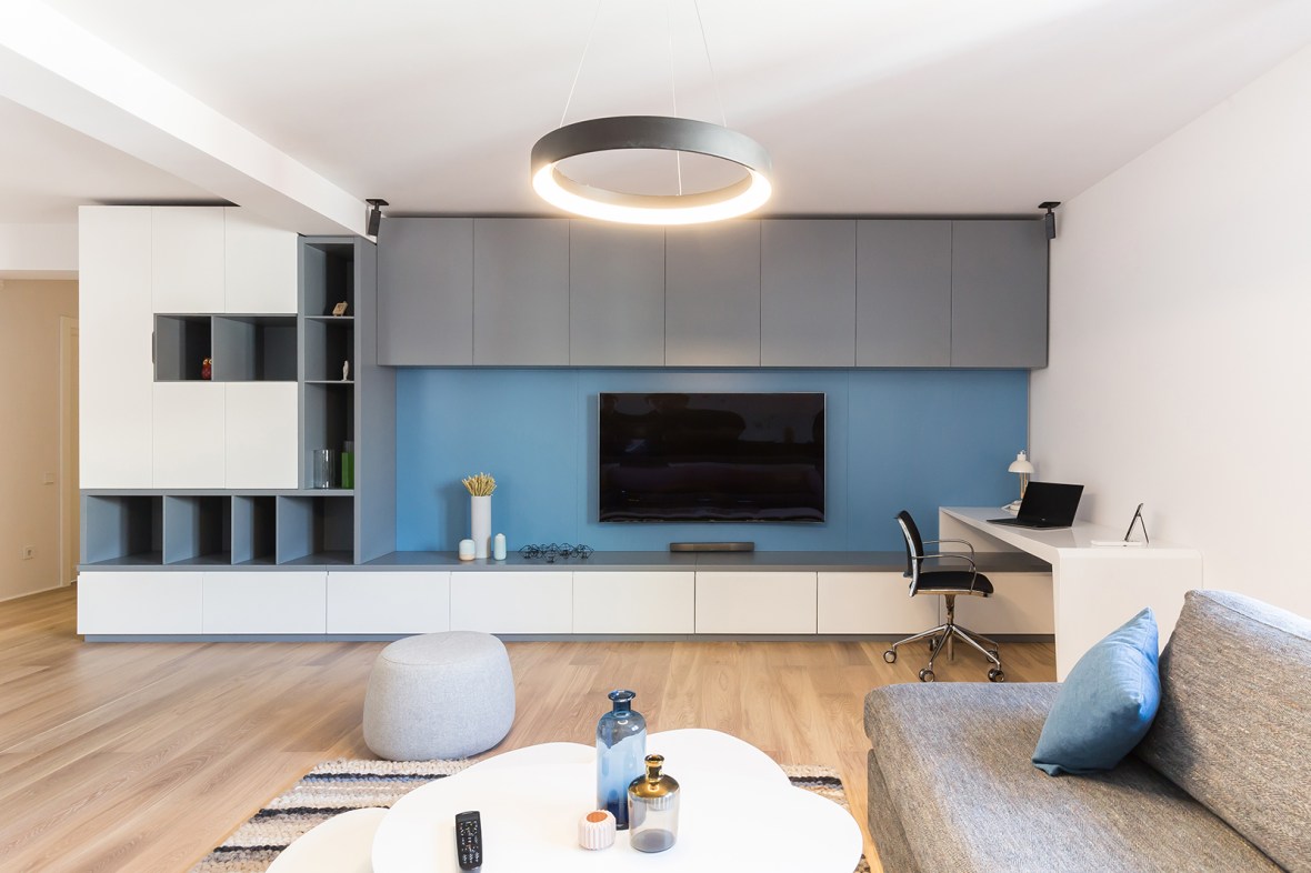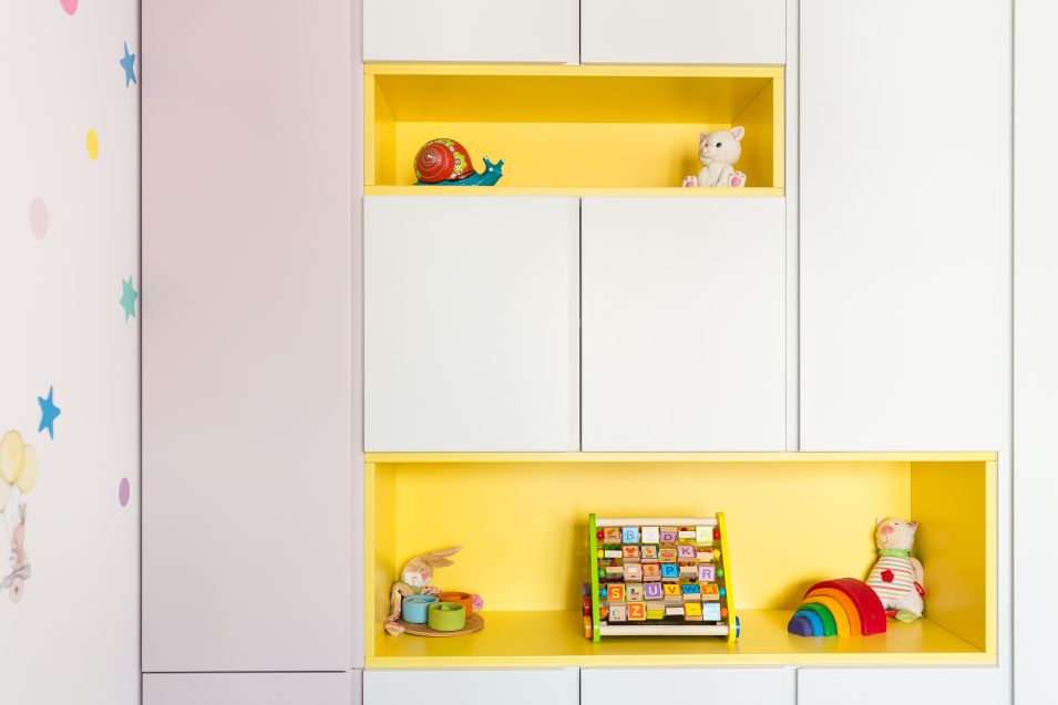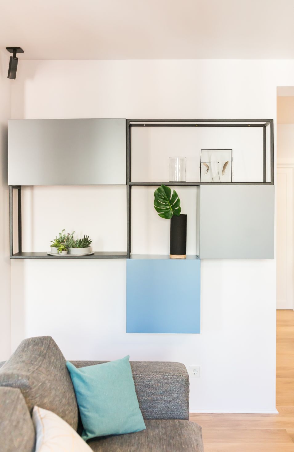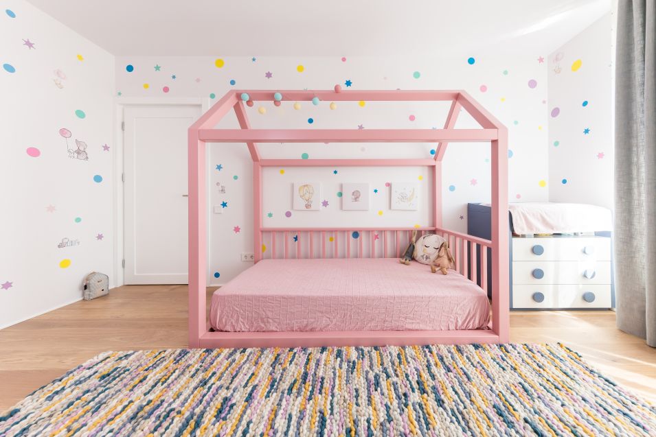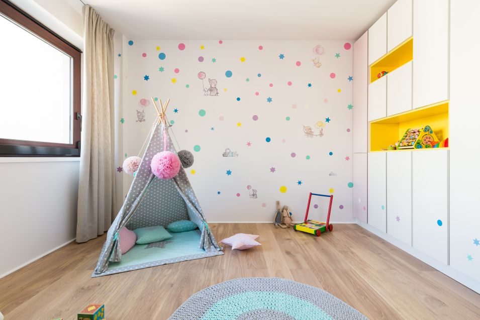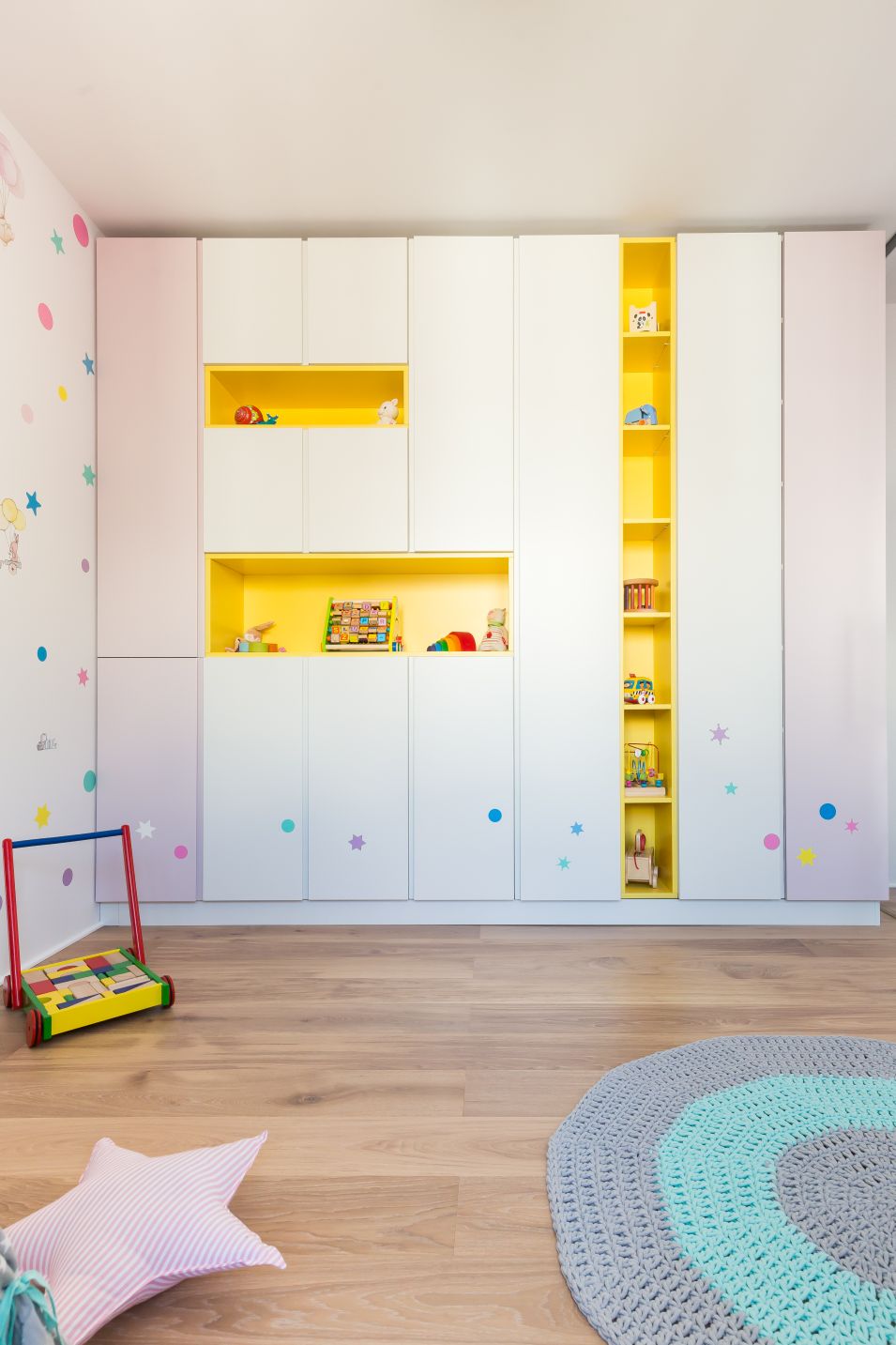Linii geometrice, volume clare, culori curajoase, aceasta ar fi descrierea pe scurt a apartament modern situat in zona de nord a Bucurestiului si amenajat de echipa JoocaStudio. Camera fetitei a fost amenajata dupa principiile Montessori: patul tip casuta plasat direct pe pardoseala, cortul si rafturile de jucarii joase dau libertate de miscare copilului, fara a avea nevoie de ajutorul parintilor. Camera de joaca a fetitei din zona camerei de zi, a fost separata de dining printr-un perete de sticla, astfel incat sa se pastreze unitatea vizuala a spatiului, dar sa fie si izolata fonic. Spatiul de zi este aerisit, amenajat in volume simple si culori naturale.