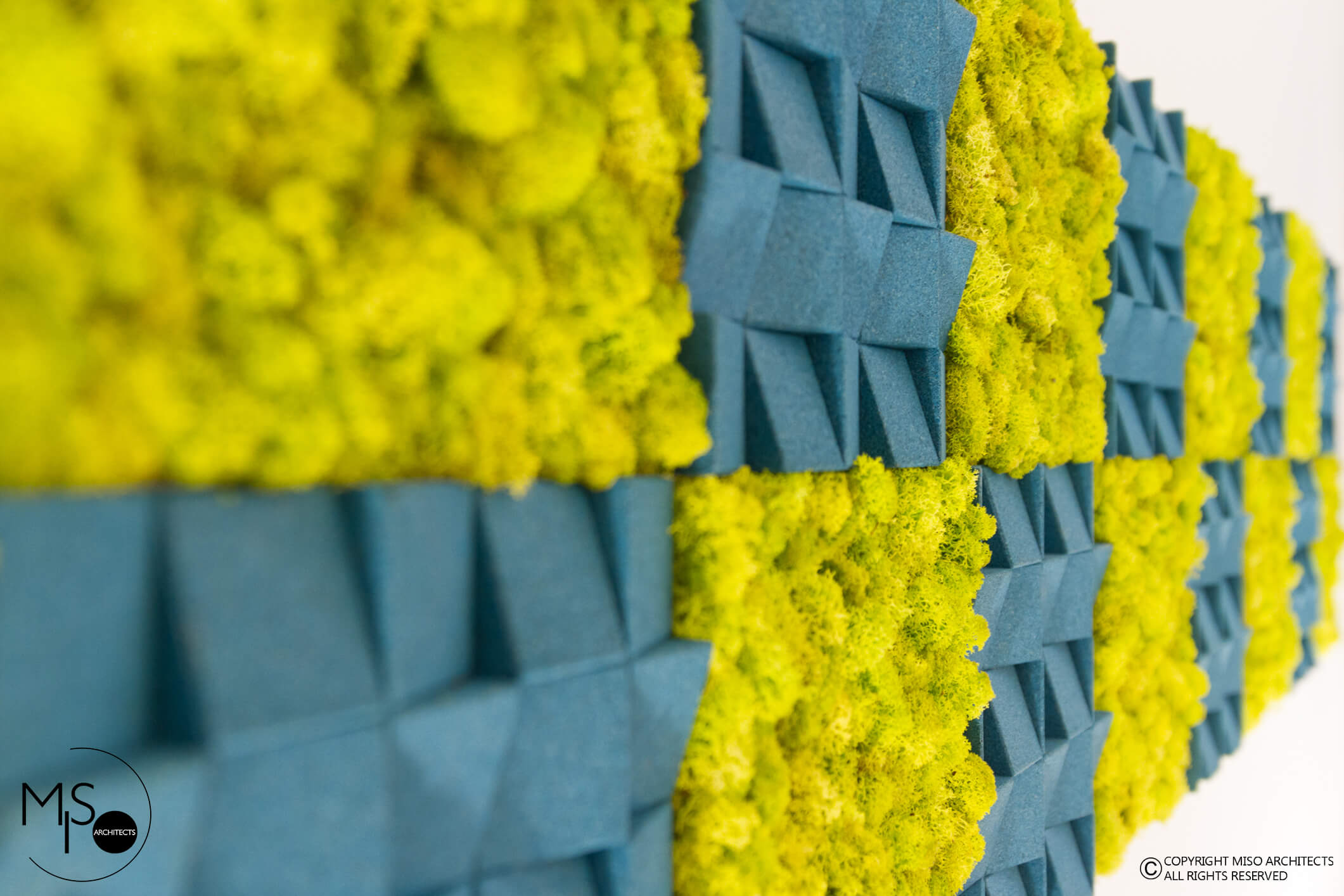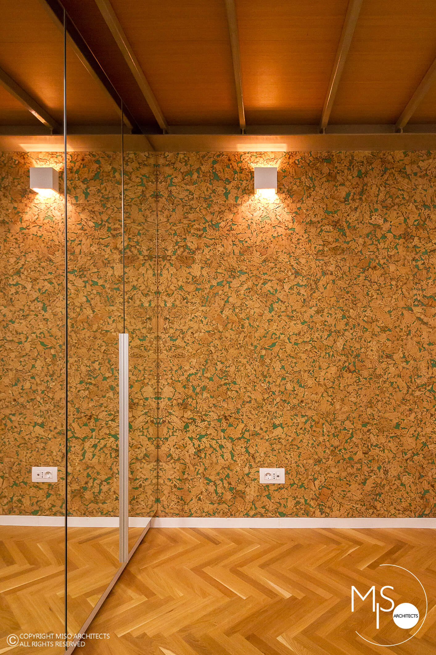Am folosit şi două tipuri de plută în această amenajare, ambele achiziţionate de la DMG Art, placarea din dormitorul înalt cu inserţii de culoare verde şi compoziţia de plută turquoise cu licheni aşezată deasupra patului din dormitorul matrimonial.